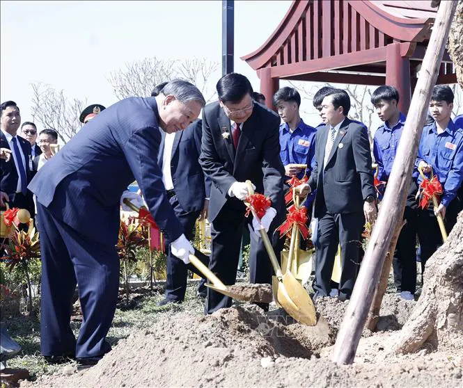 Tổng Bí thư Tô Lâm cùng Tổng Bí thư, Chủ tịch nước Lào Thongloun Sisoulith trồng cây lưu niệm tại lễ khánh thành Công viên Hữu nghị Lào - Việt Nam. Ảnh: TTXVN