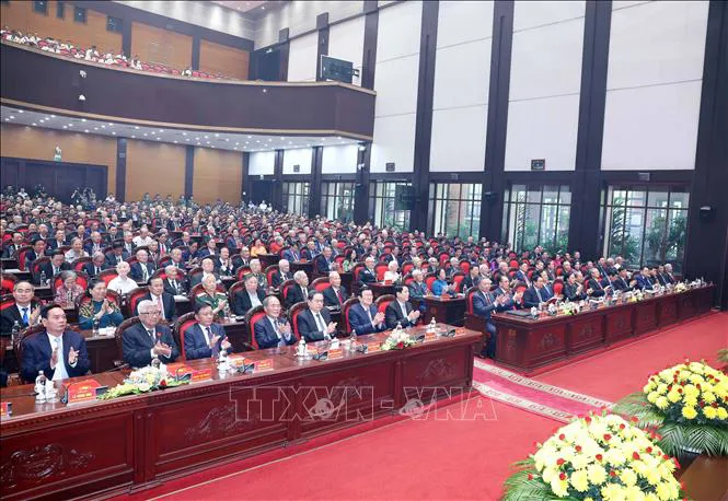 Tổng Bí thư Tô Lâm và các đồng chí lãnh đạo, nguyên lãnh đạo Đảng, Nhà nước tham dự buổi gặp mặt. Ảnh: Thống Nhất/TTXVN