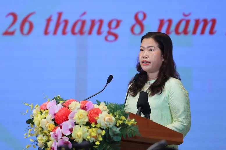 Bà Ngân Thị Hà, hộ nghèo dân tộc Thái tại Lào Cai, đại diện cho các gia đình trong diện được hỗ trợ trên cả nước, chia sẻ cảm xúc tại Hội nghị. Ảnh: VGP/Nhật Bắc