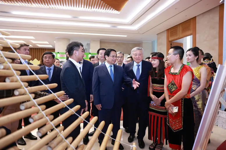Thủ tướng Phạm Minh Chính, Phó Thủ tướng Thường trực Nguyễn Hòa Bình xem các sản phẩm OCOP trưng bày tại Hội nghị. Ảnh: VGP/Nhật Bắc