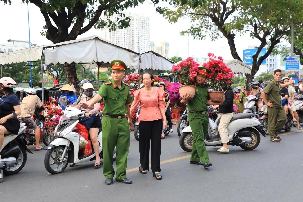 Không chỉ làm tròn trách nhiệm, các anh còn âm thầm trao đi những hành động rất đời thường: nhẹ nhàng nhắc bà con giữ gìn tư trang giữa đám đông; giúp người bán chỉnh lại chậu hoa bị nghiêng; dìu một cụ già bước qua đoạn đường trơn ướt; hướng dẫn khách gửi xe đúng nơi quy định để lối đi thêm thông thoáng. Những việc nhỏ bé ấy tưởng chừng giản đơn, nhưng lại tiếp thêm sự yên tâm cho người bán, sự an lòng cho người mua trong những ngày cuối năm tất bật.