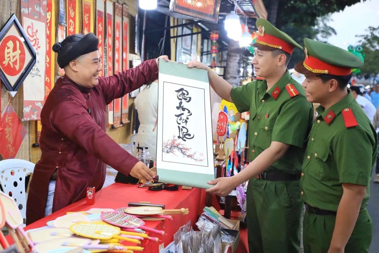 Có những khoảnh khắc rất đỗi ấm áp: một chiến sĩ trẻ mỉm cười khi nhận bức thư pháp “Bình an” từ ông đồ già nơi góc chợ; một cái gật đầu thay lời chúc Tết sớm; hay ánh mắt rưng rưng cảm ơn của cụ bà khi được đỡ qua đám đông. Những nụ cười mộc mạc ấy như hòa vào sắc hoa, làm cho bức tranh Xuân thêm phần nghĩa tình.