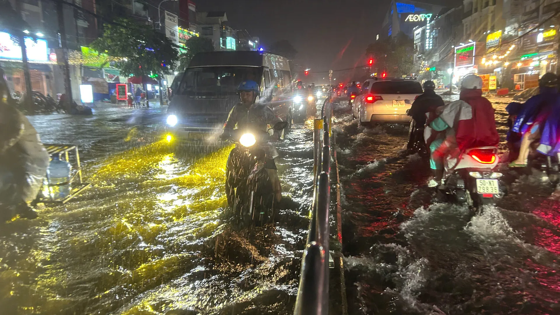 Chiều 8/10, một trận mưa to kéo dài nhiều giờ đồng hồ đã làm nhiều con đường tại TP Hồ Chí Minh bị ngập nặng. Tại phường An Khánh (TP Thủ Đức cũ), nhiều tuyến đường bị ngập sâu, như đường Quốc Hương ngập từ 30 - 50cm, dẫn đến hàng loạt xe chết máy, người dân phải dẫn bộ trong dòng nước.