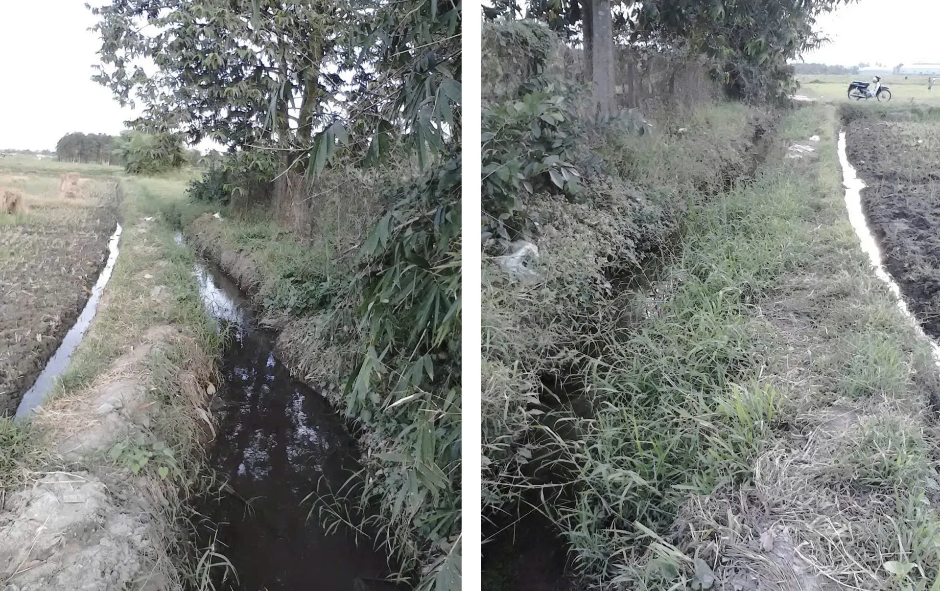 Hình bên trái chụp từ ngoài hẻm lớn vào, hình bên phải chụp từ trong ra (lúc này một bên đã có hàng rào lưới B40). Mương nước và bờ mương chính là con hẻm rộng 3m hình thành sau này và hẻm 3m này đã tồn tại hàng chục năm cho đến lúc bị cá nhân rào chắn. Ảnh: NDCC.