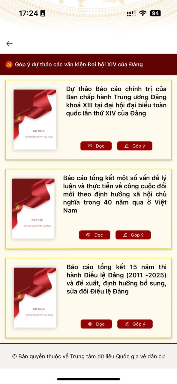 Rồi nhấn vào thanh tìm kiếm để chọn đọc nội dung dự thảo văn kiện Đại hội. Sau đó màn hình hiển thị nội dung dự thảo văn kiện công dân vừa chọn.