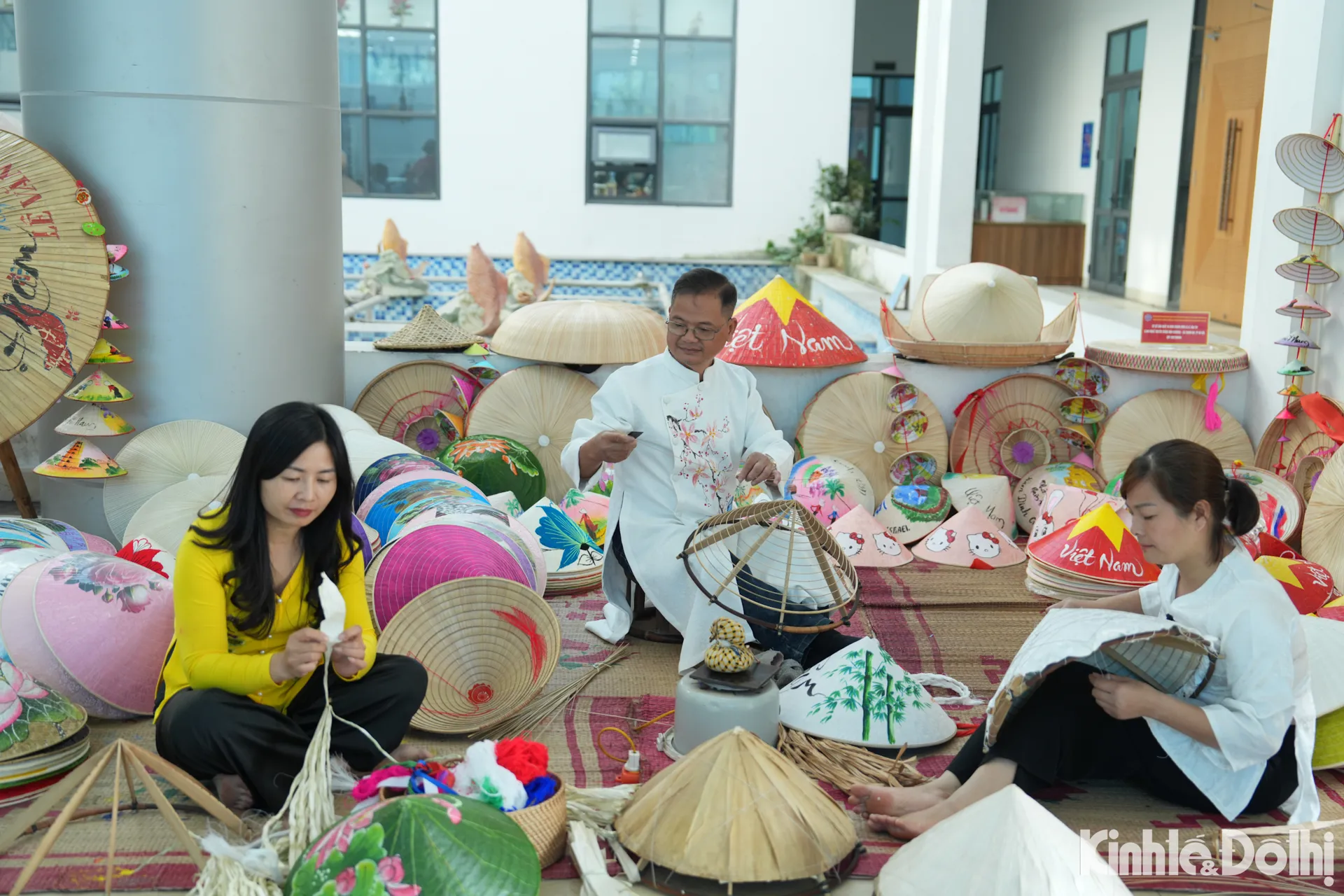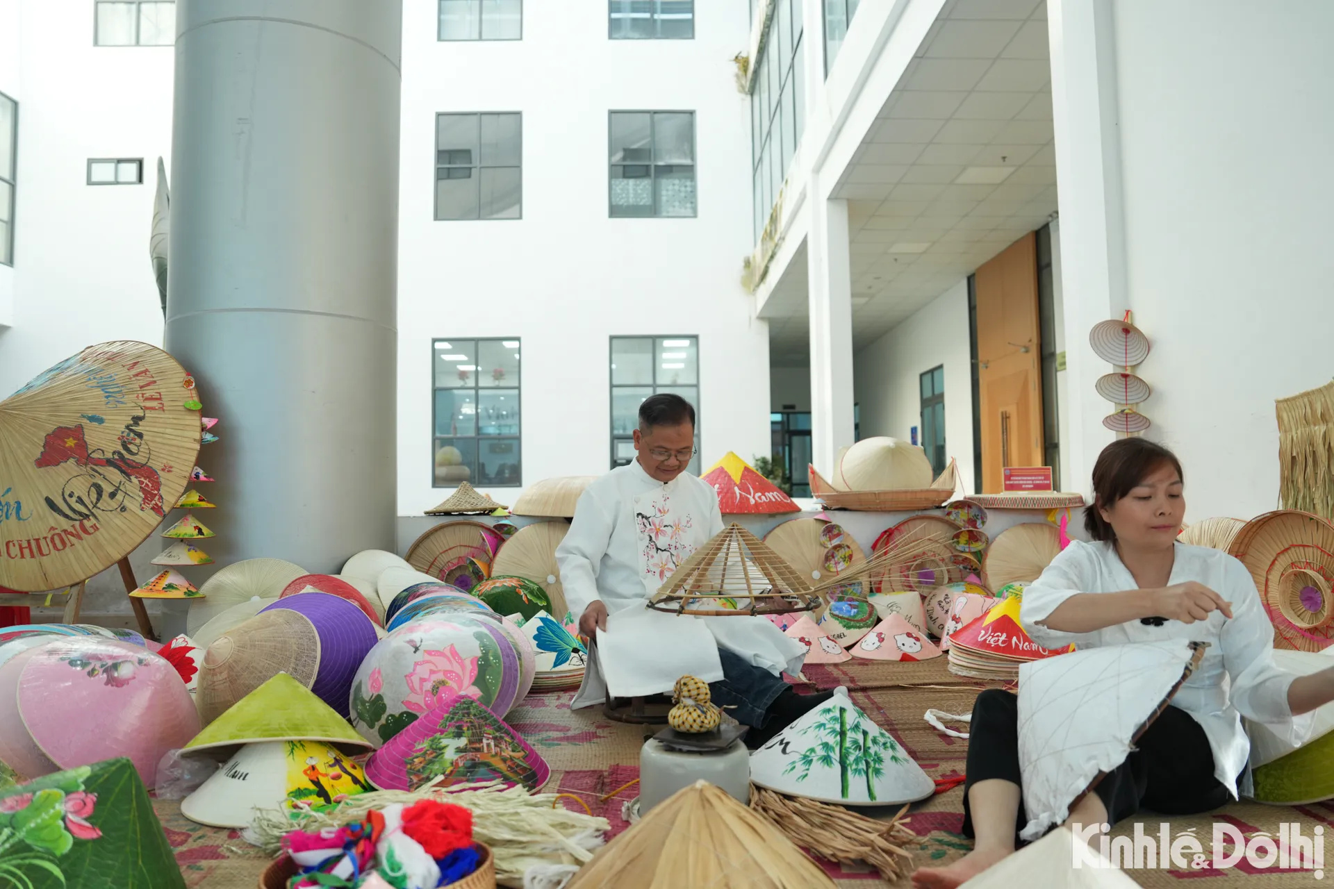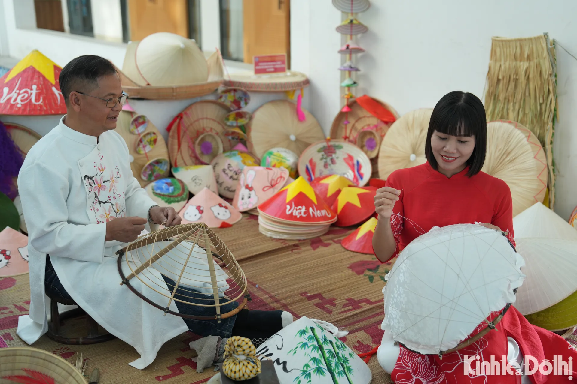 Không gian trải nghiệm làm nón làng Chuông thu hút sự quan tâm của các đại biểu.