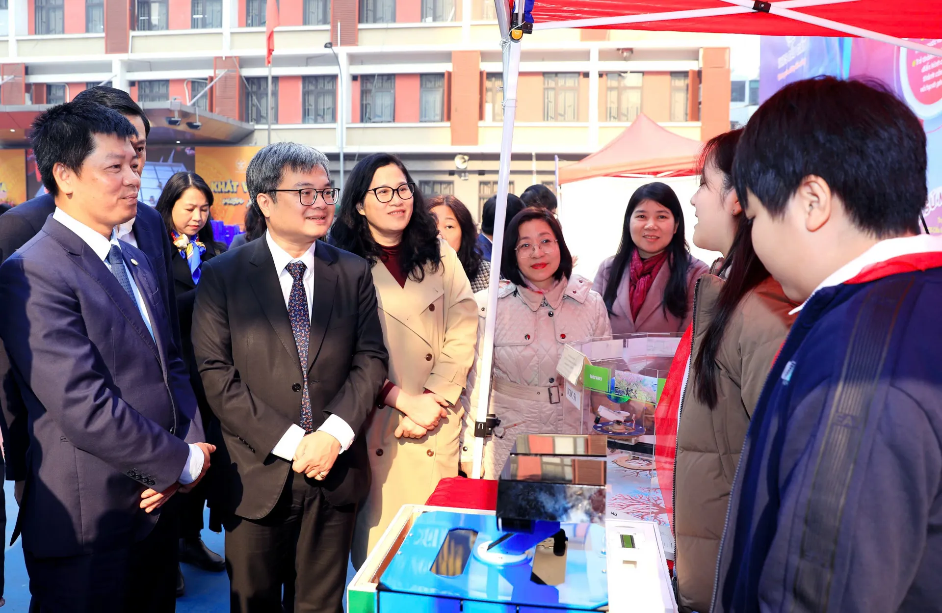 Phó Chủ tịch UBND thành phố Hà Nội Trương Việt Dũng tham quan các mô hình chuyển đổi số tại Trường THCS Cầu Giấy.
