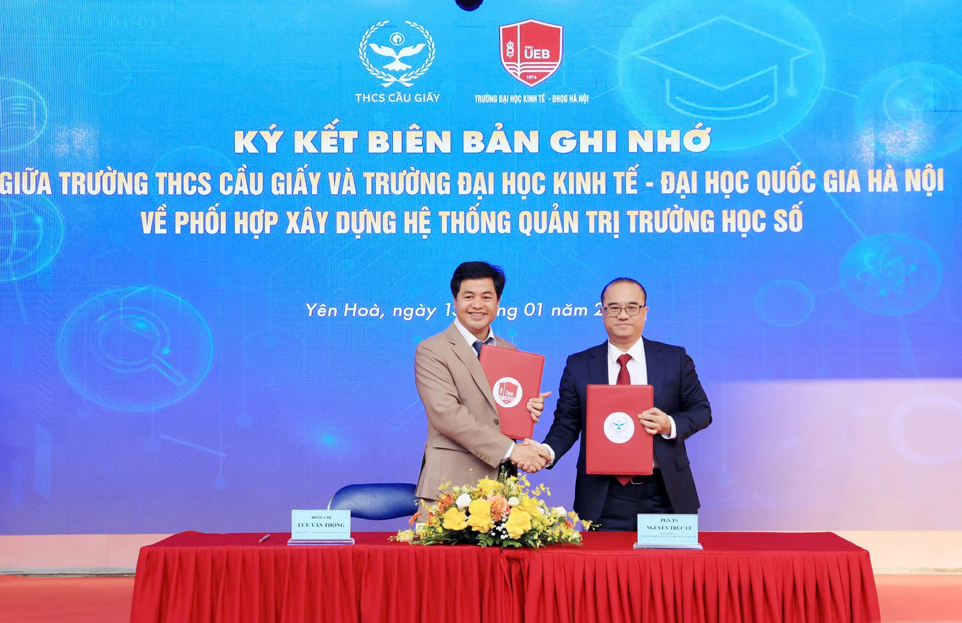 Trong khuôn khổ chương trình, lễ ký kết biên bản ghi nhớ hợp tác hệ thống quản trị nhà trường trên nền tảng LMS và chung khảo cuộc thi “Robot Soccer Championship – Cầu Giấy 2026” cũng đã diễn ra thành công.