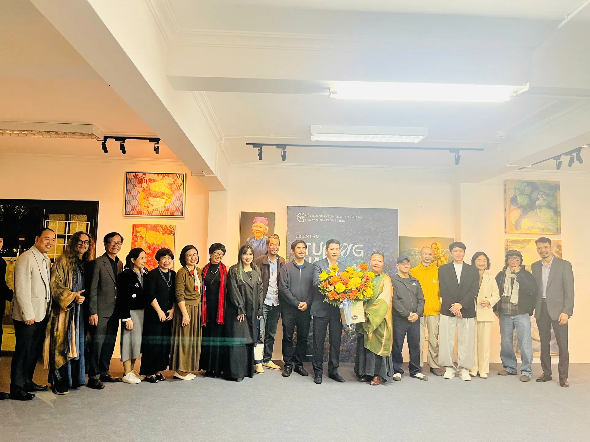 Giám đốc Sở VH&TT Hà Nội Phạm Tuấn Long tặng hoa các nghệ sĩ có tác phẩm tham gia triển lãm.