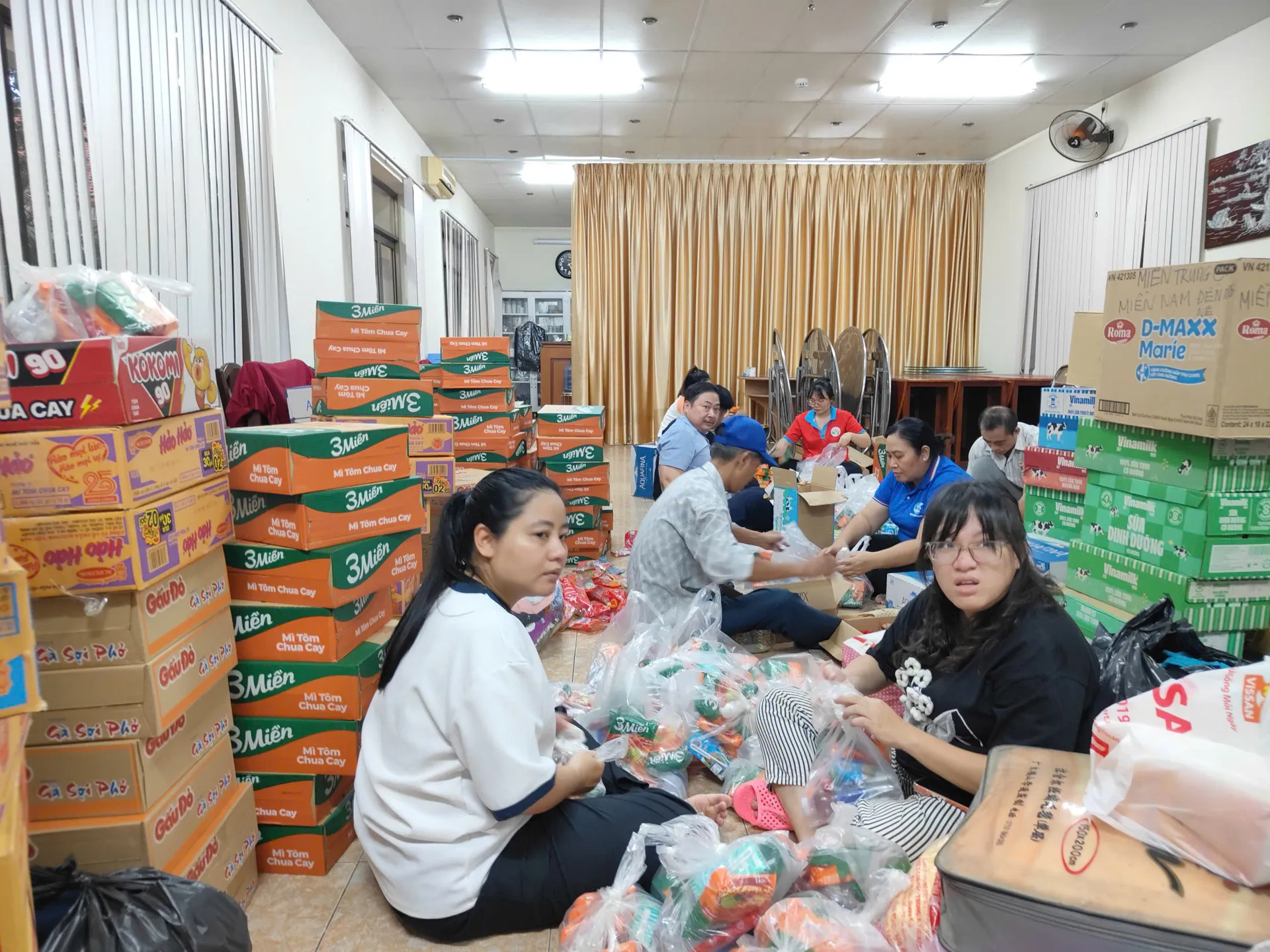 Nhân dân phường Bình Thạnh cùng chung tay gói hàng hóa để chuyển kịp thời chuyển đến đồng bào tỉnh Khánh Hòa. Ảnh: Quỳnh Hoa