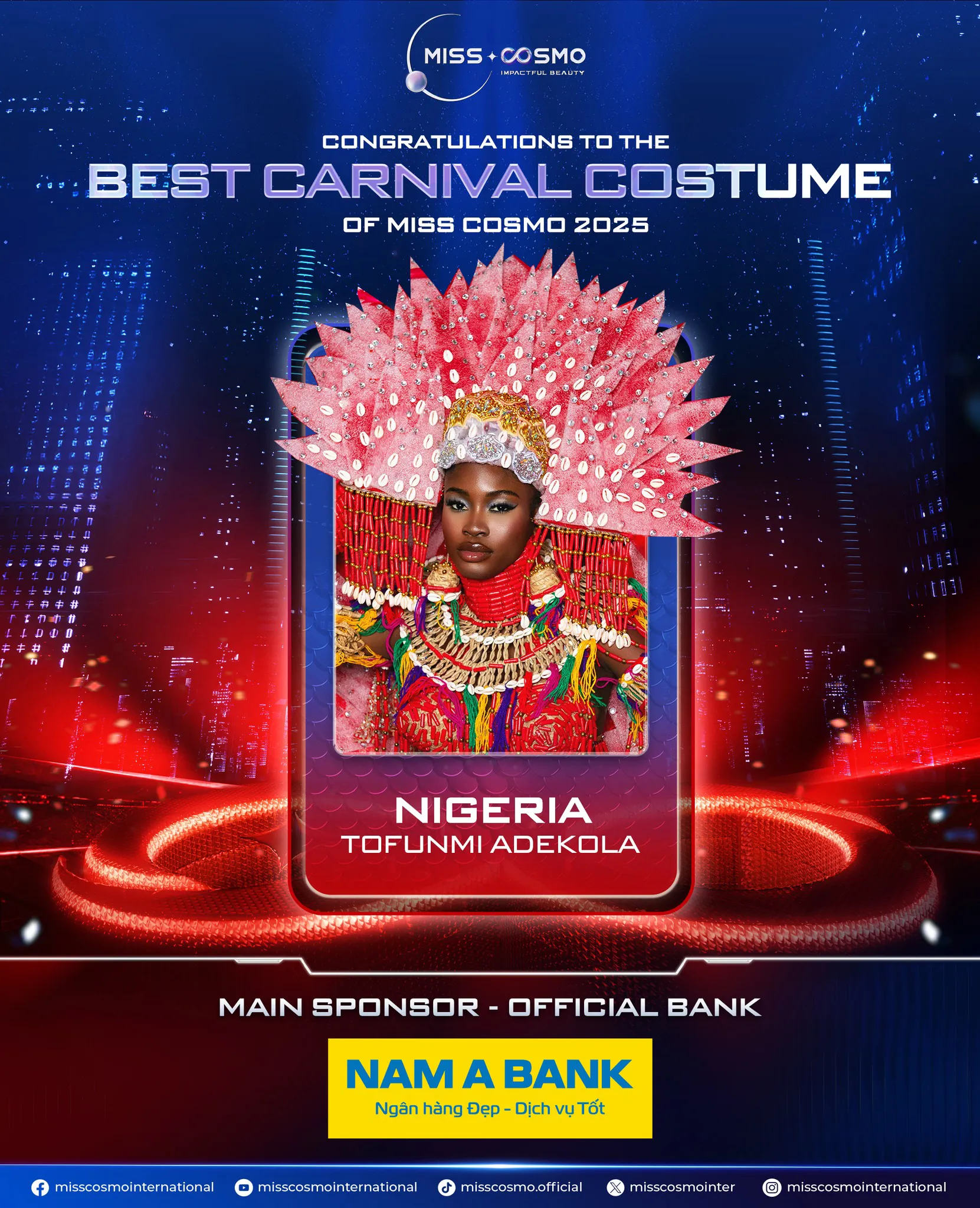 Hoa hậu Cosmo Nigeria - Tofunmi Adekola, người chiến thắng của Trang phục Carnival Đẹp nhất tại Lễ hội Âm nhạc & Âm nhạc Đẹp nhất Miss Cosmo 2025.