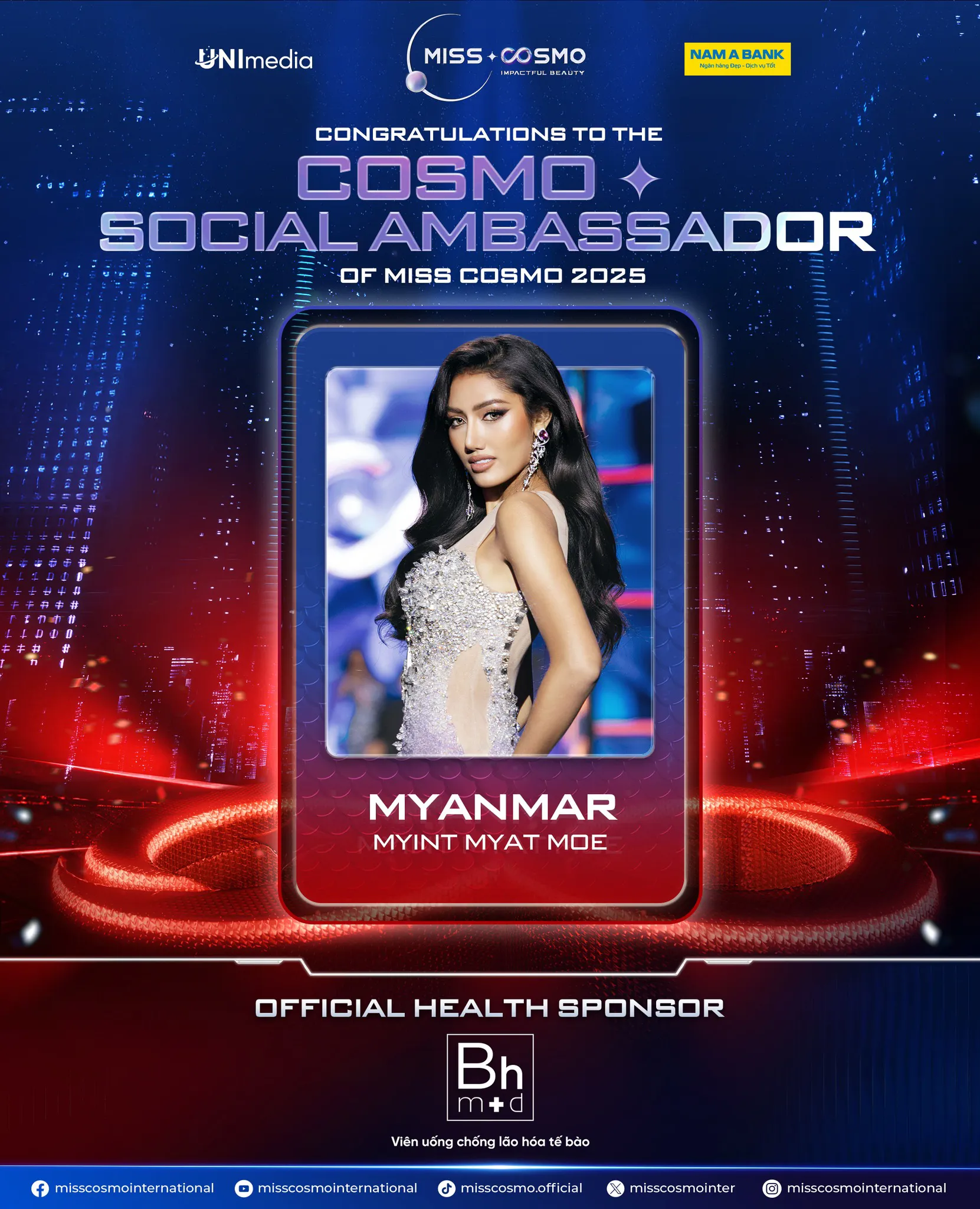 Hoa hậu Cosmo Myanmar - Myint Myat Moe, người chiến thắng Đại sứ Xã hội Cosmo tại Lễ hội Âm nhạc & Sắc đẹp Miss Cosmo 2025.