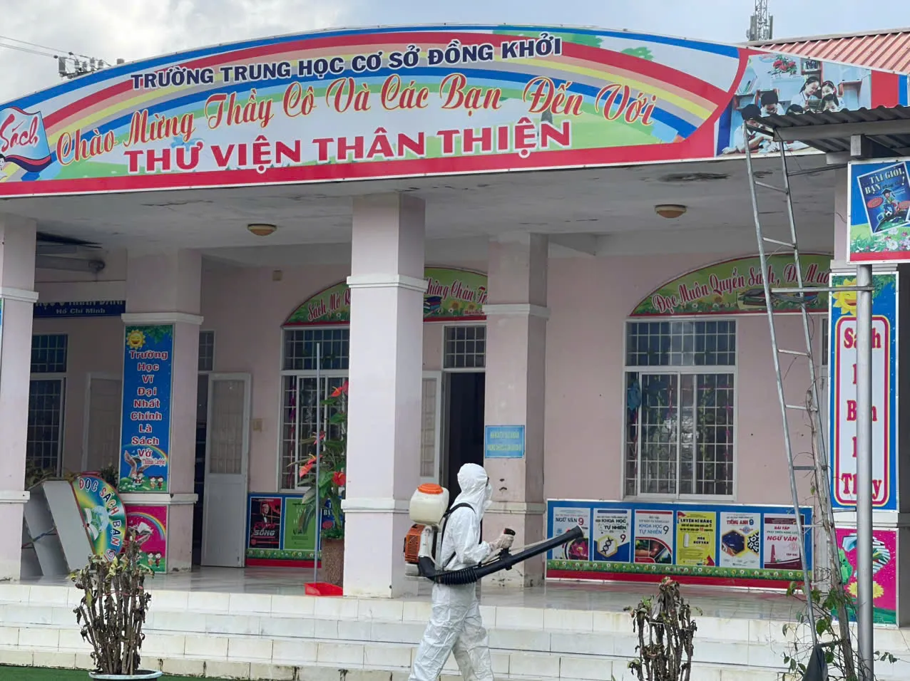 Các cán bộ cảnh sát Trung đoàn Cảnh sát cơ động Tây Nguyên khử khuẩn trường học sau lũ.