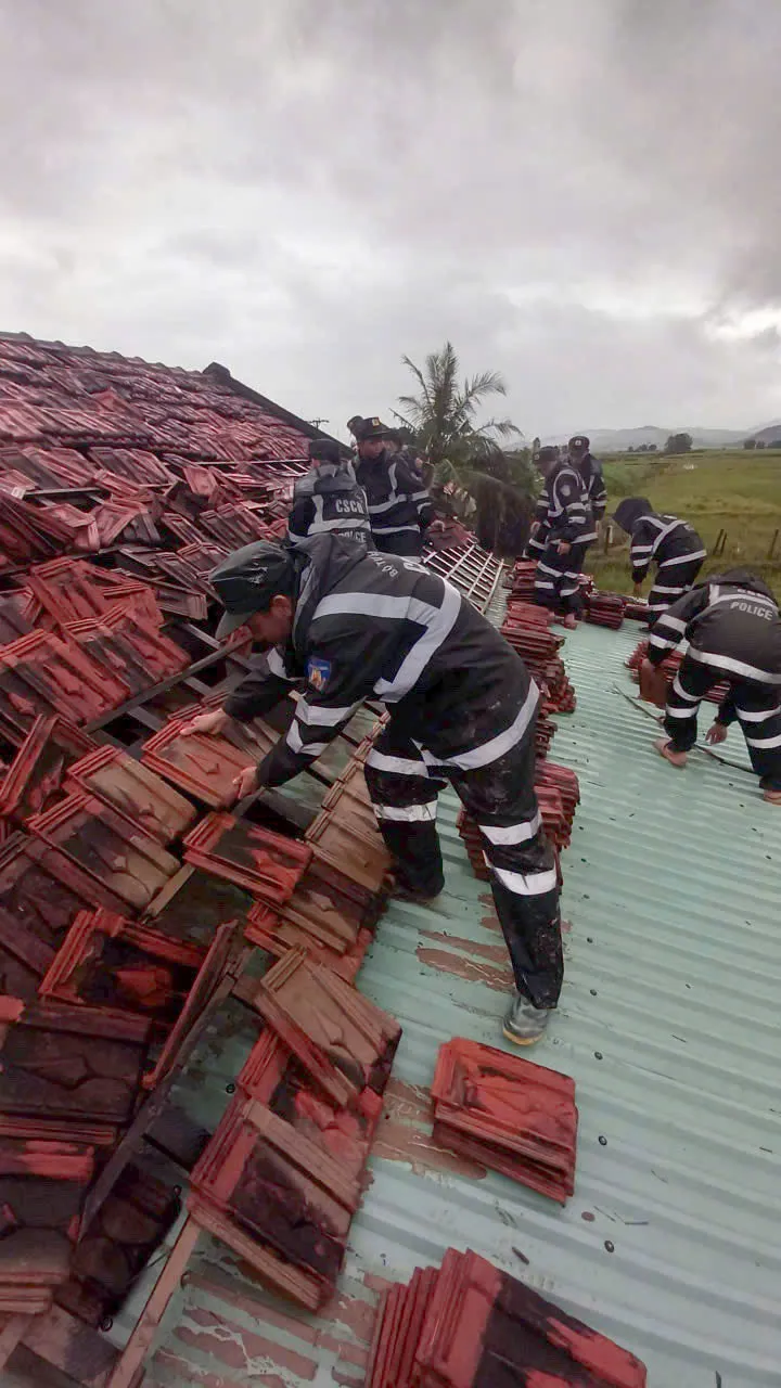 Các cán bộ cảnh sát Trung đoàn Cảnh sát cơ động Tây Nguyên lợp mái nhà giúp người dân.