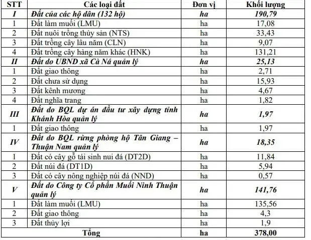 Theo báo cáo nghiên cứu khả thi, dự án sẽ chuyển đổi hơn hơn 170ha đất làm muối, đất nuôi trồng thủy sản và đất rừng sang đất công nghiệp. Cụ thể, có 18,35ha đất rừng phòng hộ, 14,22ha đất làm muối và 159,15ha đất nuôi trồng thủy sản (chủ yếu làm muối), bên cạnh 182,58ha đất trồng cây hàng năm. Sở Nông nghiệp và Phát triển nông thôn tỉnh Ninh Thuận (cũ) xác nhận diện tích rừng trong khu vực là đất trống, cỏ dại mọc, không có rừng tự nhiên. Phần đất làm muối hiện do Công ty Cổ phần Muối Cà Ná Ninh Thuận (hơn 135ha) và người dân quản lý, sản xuất (hơn 17ha).