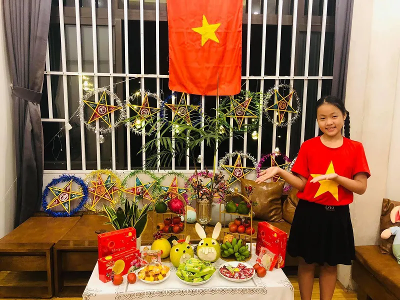 Các em tự biên, tự diễn, trang trí những mâm cỗ Trung thu rất sáng tạo, đẹp mắt bằng những vật liệu đơn giản tại nhà. Cách thuyết trình, giới thiệu bản thân đầy dí dỏm, ngộ nghĩnh cùng những điệu nhảy chuyên nghiệp trên nền nhạc sôi động mong sao cho Covid-19 qua mau… Hình ảnh lá cờ Tổ quốc được treo trang trọng giữa nhà, bên dưới là mâm ngũ quả, bàn tay bé nhỏ kính cẩn chào lá cờ Tổ quốc chắc có lẽ để lại trong tôi nhiều ấn tượng. Đó là sự “Chung tay” cùng bày biện, cùng đón ngày Tết thiếu nhi đặc biệt của các em học sinh và bố mẹ trong gia đình, như đúng chủ đề mâm cỗ Trung thu của em Vũ Phương Linh.