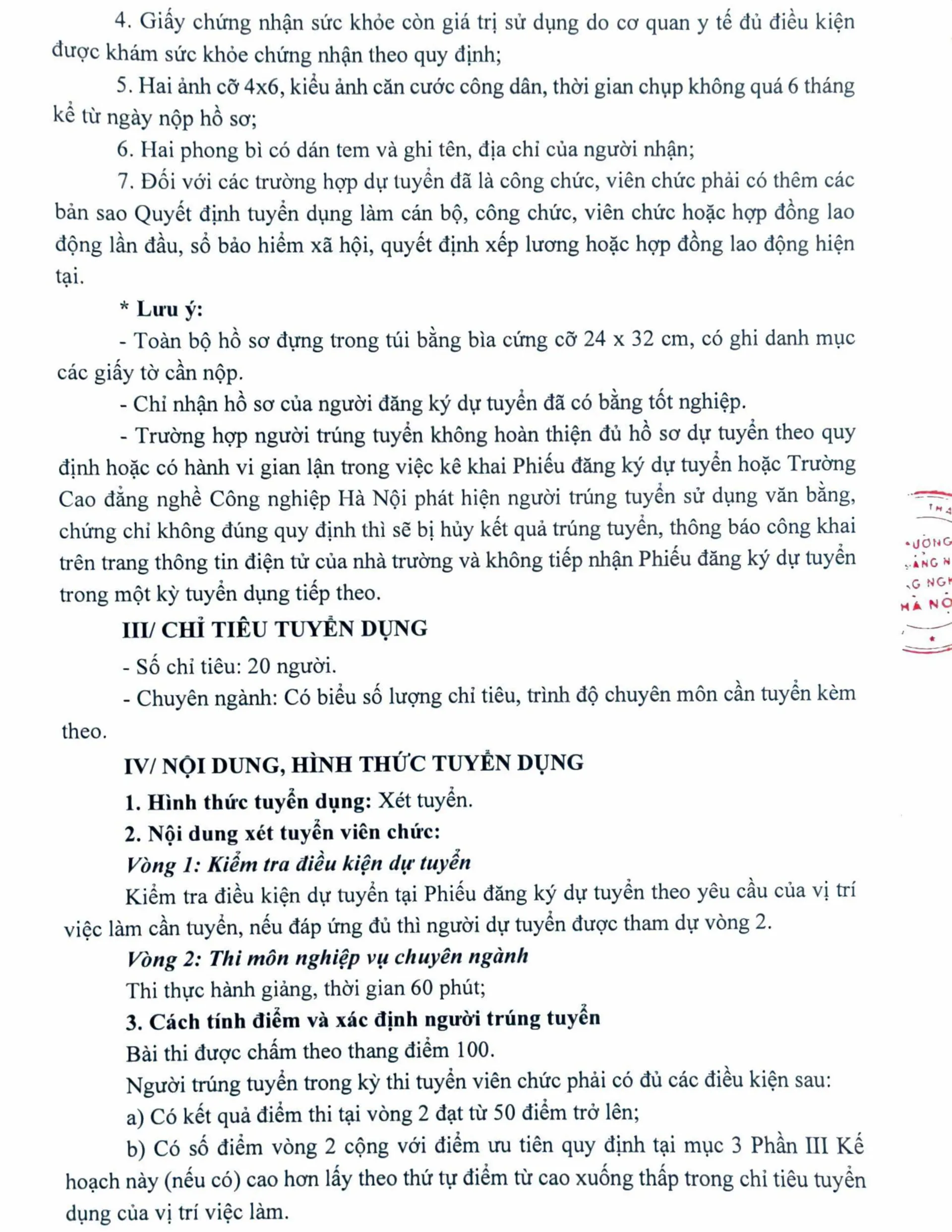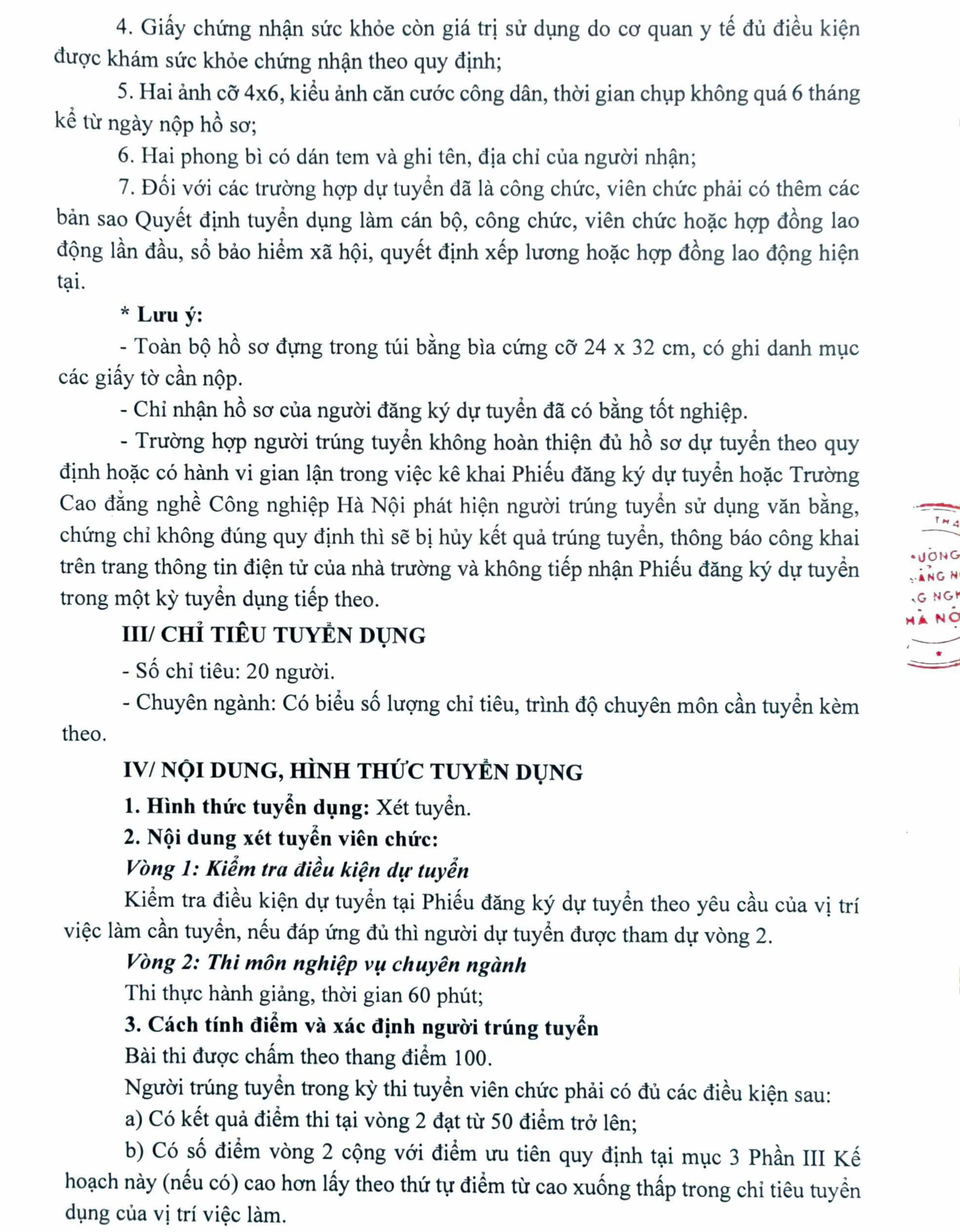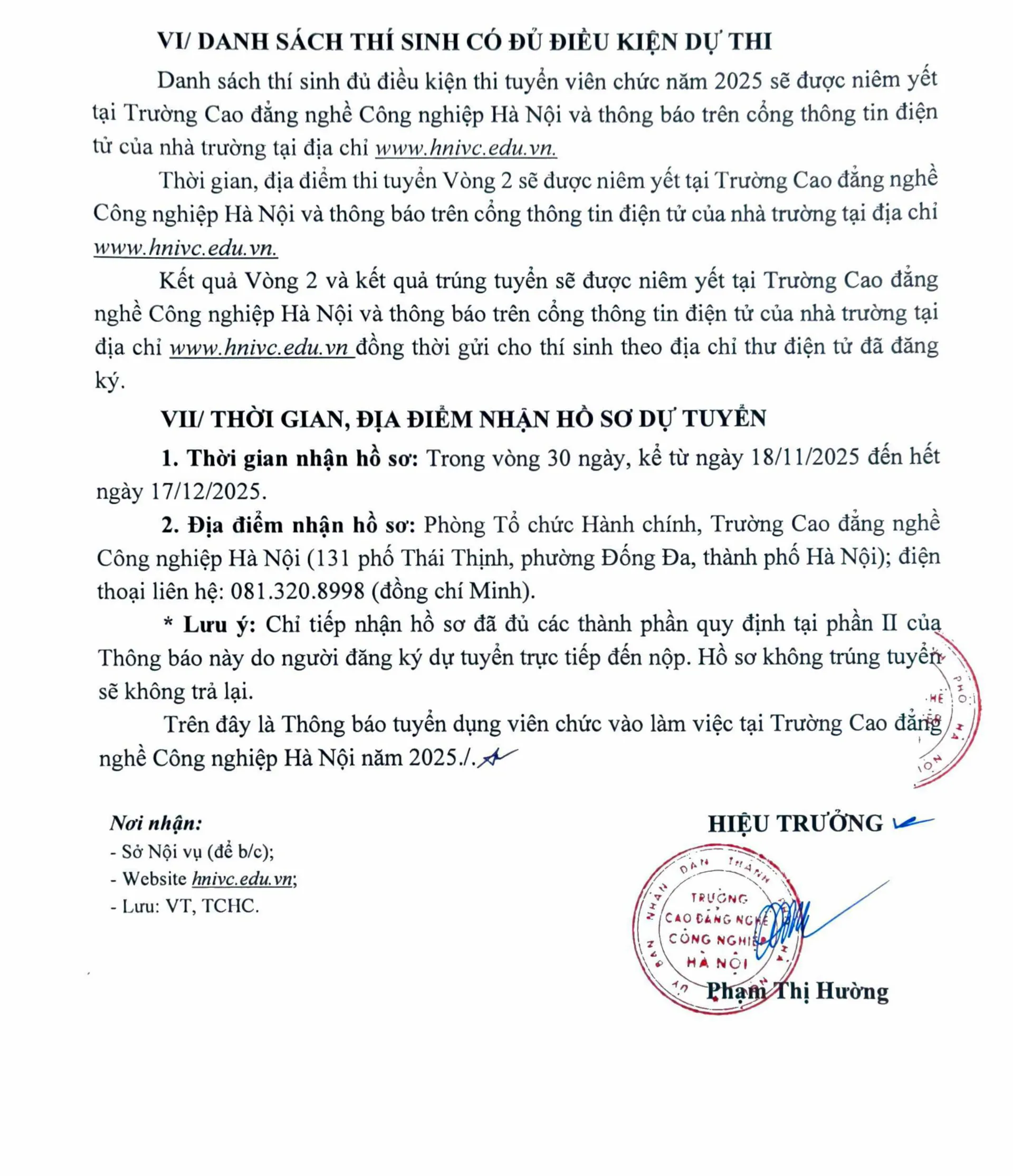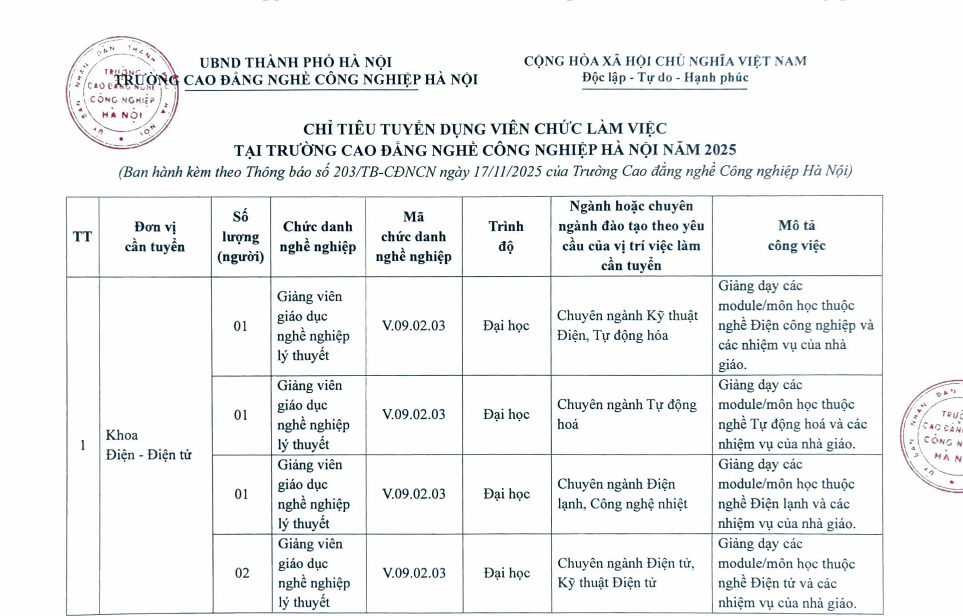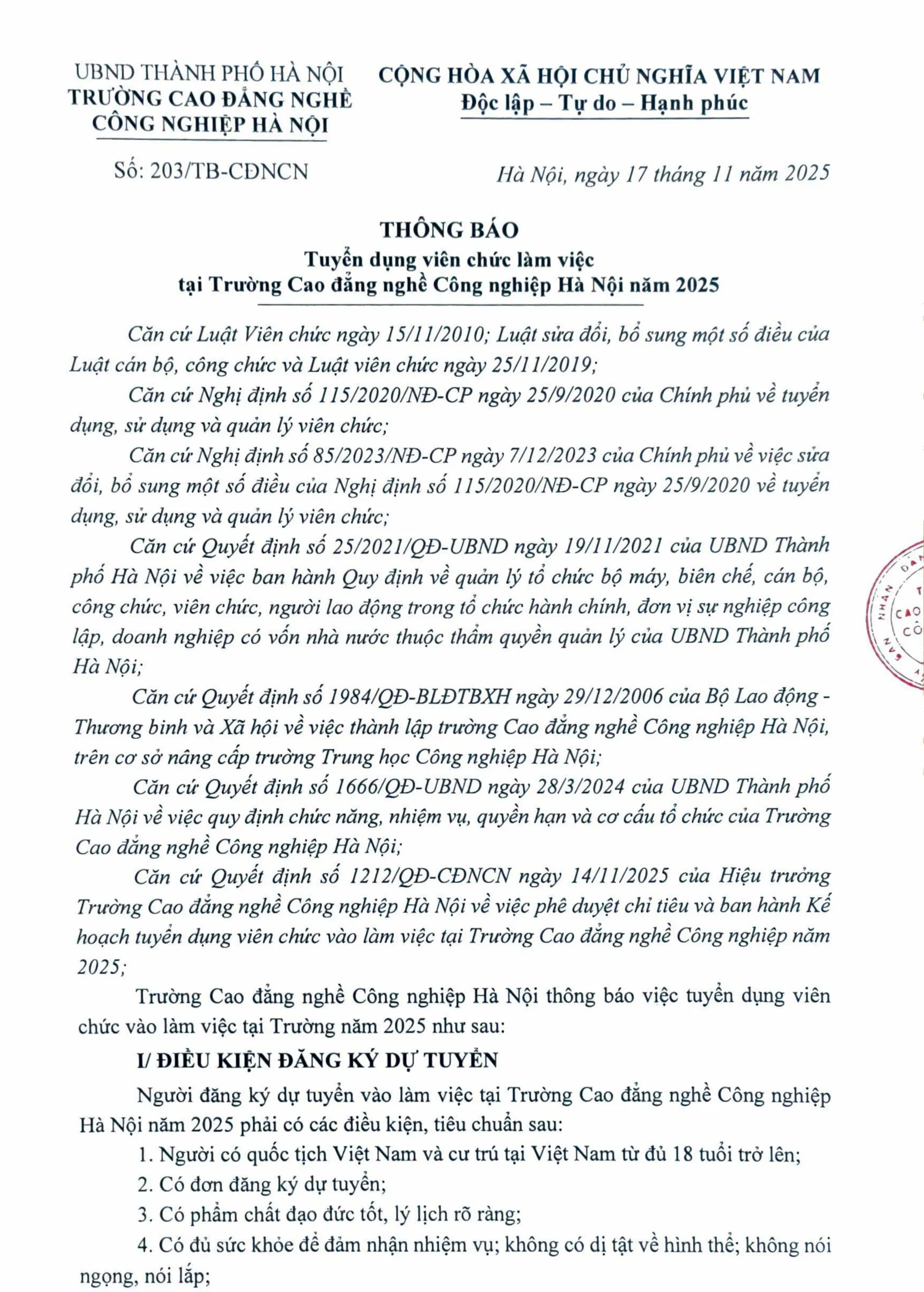 Trường Cao đẳng nghề Công nghiệp Hà Nội thông báo tuyển dụng viên chức năm 2025.