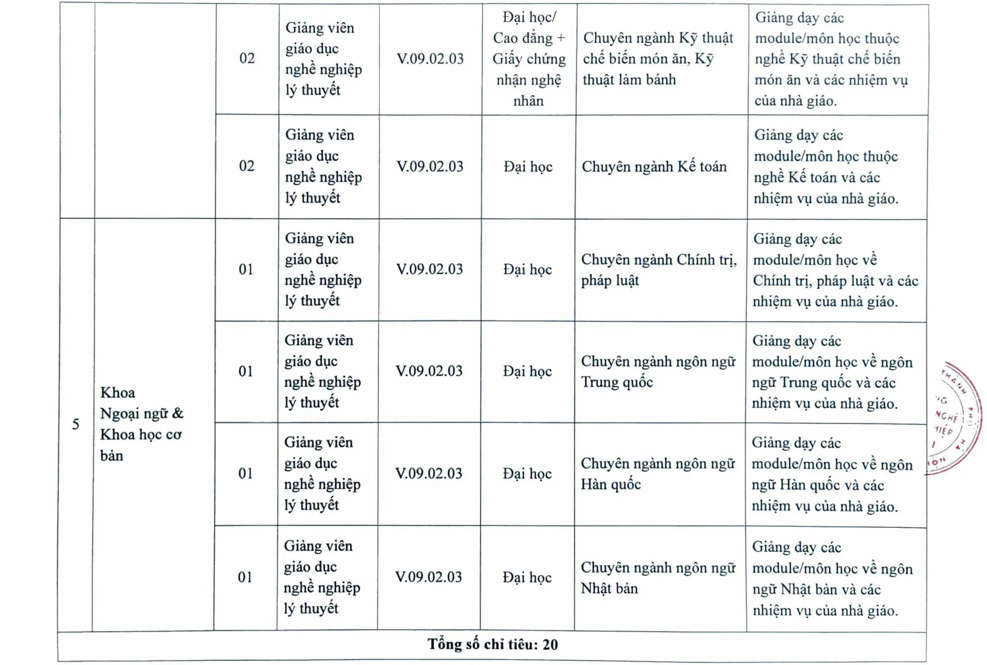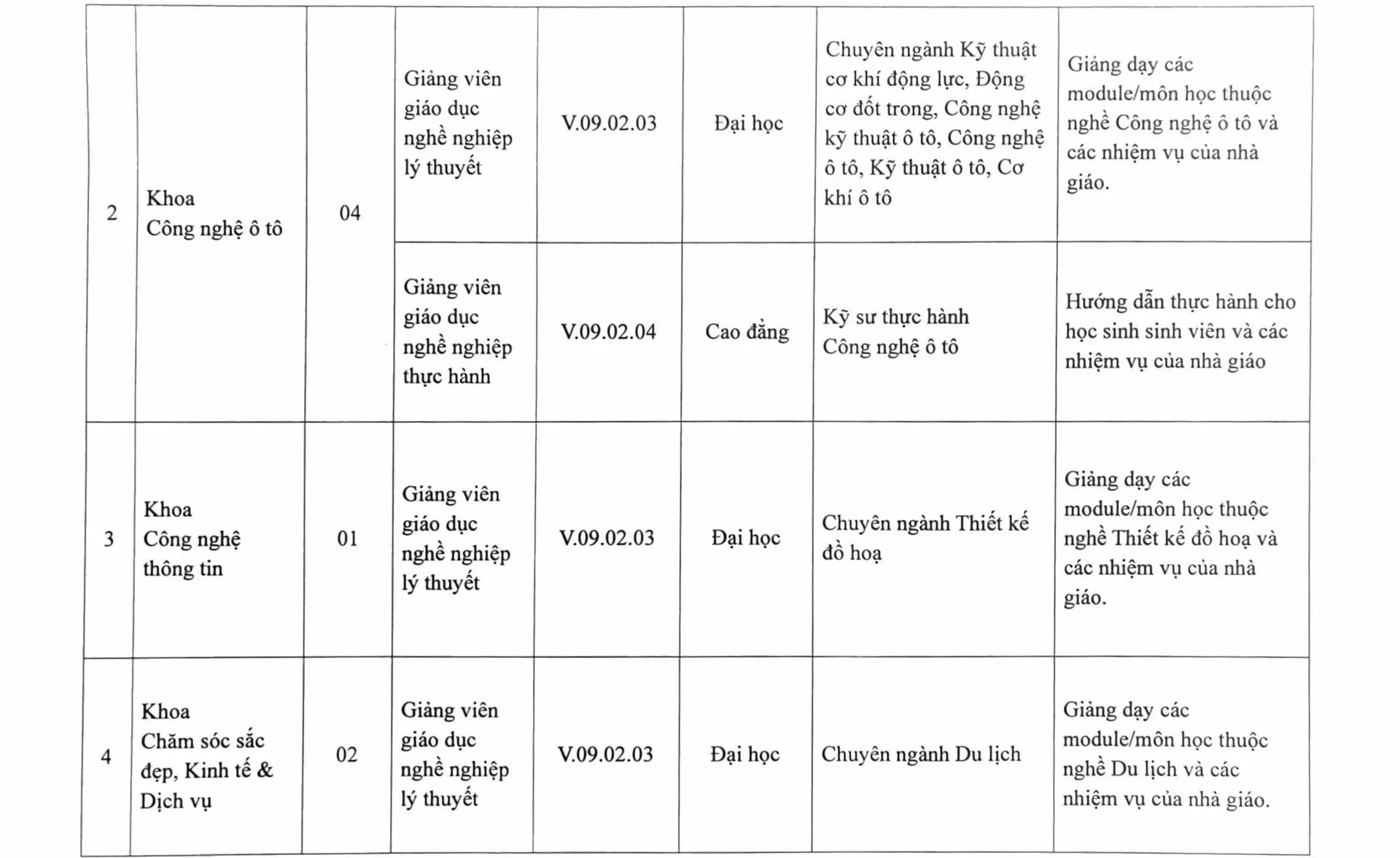 Nhà trường tuyển 20 người vào làm việc tại 5 khoa. Trong đó khoa Điện – Điện tử 5 người; khoa Công nghệ ô tô 4 người; khoa Công nghệ thông tin 1 người; khoa Chăm sóc sắc đẹp, Kinh tế & Dịch vụ 6 người; khoa Ngoại ngữ & Khoa học cơ bản 4 người.