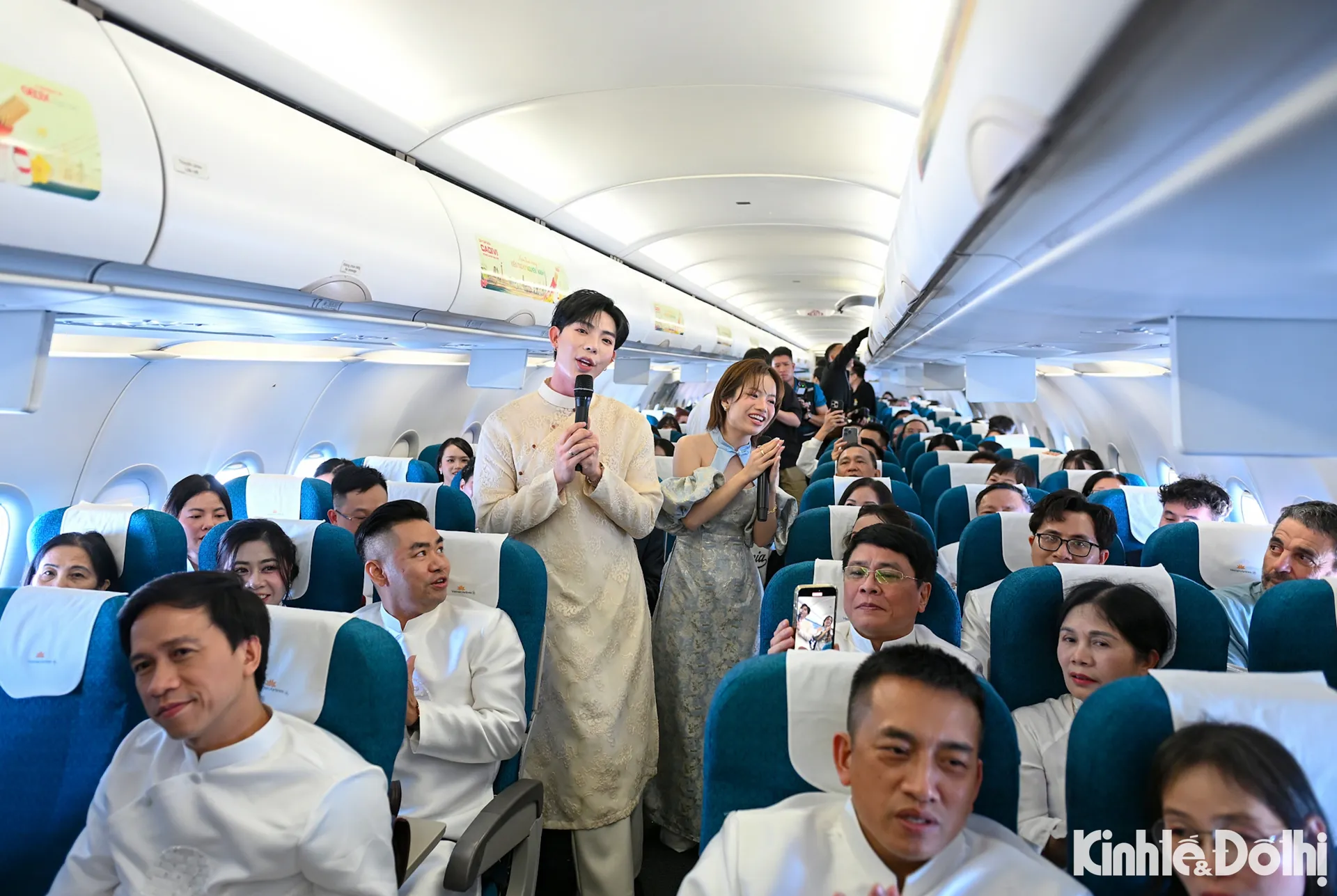 Không gian khoang hành khách trở nên ấm áp với những giai điệu ngọt ngào của ca khúc “Khúc giao mùa”. Sự xuất hiện của ca sĩ Erik và Lâm Bảo Ngọc mang đến trải nghiệm âm nhạc đặc biệt, giúp hành khách cảm nhận trọn vẹn không khí đầu năm mới ngay trên bầu trời.
