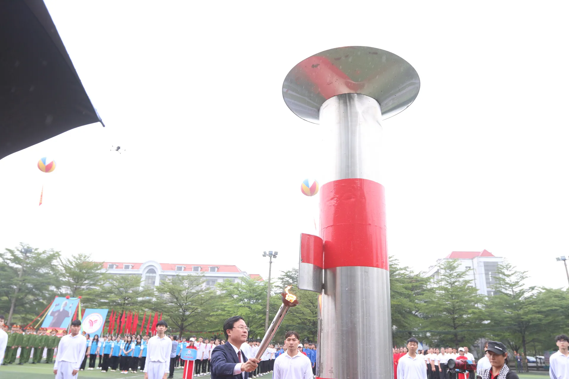 Bí thư Đảng ủy, Chủ tịch HĐND xã Tây Phương Nguyễn Minh Hồng thắp sáng đài lửa, chính thức khai mạc đại hội. Ảnh: Công Phương.