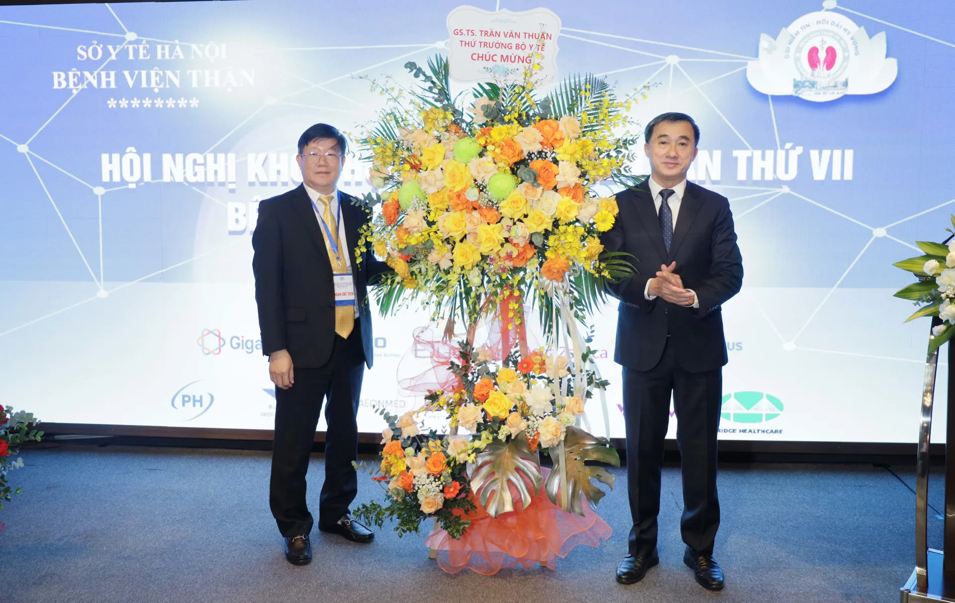 Thứ trưởng Bộ Y tế Trần Văn Thuấn tặng hoa chúc mừng 25 năm Ngày truyền thống Bệnh viện Thận Hà Nội.