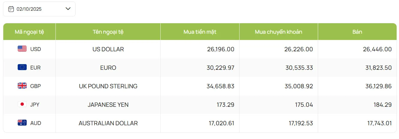Ghi nhận tỷ giá đồng VNĐ/USD hôm nay 2/10 tại 4 ngân hàng thương mại lớn, cụ thể: Tại Vietcombank niêm yết giá mua ở mức 26.196 đồng/USD, giá bán ở mức 26.446 đồng/USD, tăng 20 đồng/USD ở chiều mua, tuy nhiên giữ nguyên giá chiều bán ra so với phiên trước đó. Ngoài ra, ngân hàng Vietcombank cũng công bố tỷ giá với những ngoại tệ chủ chốt khác (xem ảnh).