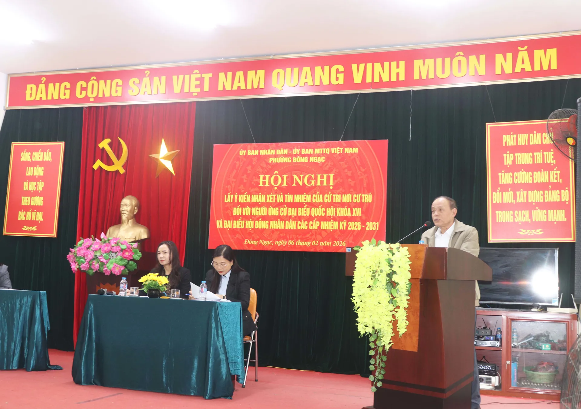 Kinhtedothi - Ngày 6/2, UBND, Ủy ban MTTQ phường Đông Ngạc tổ chức hội nghị lấy ý kiến nhận xét và tín nhiệm của cử tri nơi cư trú đối với người ứng cử đại biểu Quốc hội khoá XVI và đại biểu HĐND các cấp nhiệm kỳ 2026 – 2031. Tới dự có Phó Bí thư Thường trực Đảng ủy phường Đông Ngạc Dương Ngọc Thanh; Phó Bí thư Thường trực Đảng ủy phường Thượng Cát Nguyễn Thị Thuỷ; Chủ tịch UBND phường Thượng Cát Lê Thị Thu Hương.
