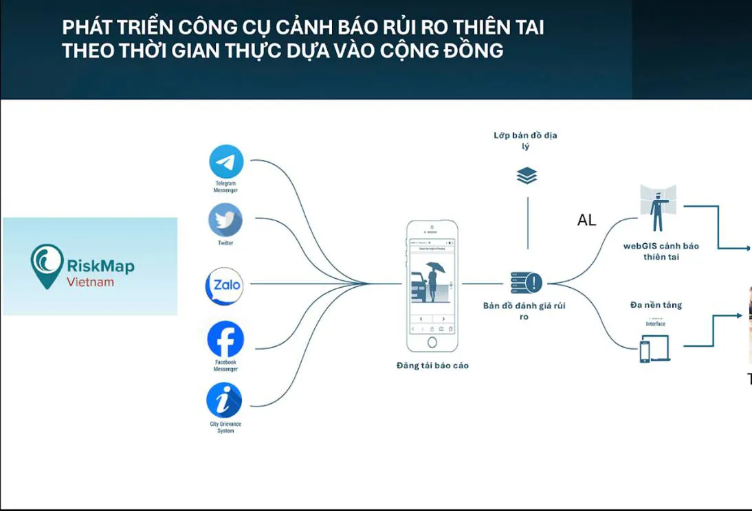 Song song với AI, việc tận dụng dữ liệu cộng đồng đang mở ra một hướng đi mới. Một sản phẩm nghiên cứu có tên RiskMap Vietnam được phát triển trên cơ sở phối hợp giữa Urban Risk Lab (Viện Công nghệ Massachusetts, Mỹ) và Khoa Kỹ thuật Tài nguyên nước, trường Đại học Thủy lợi có thể tiếp nhận thông tin ngập lụt từ cộng đồng để thiết lập bản đồ theo thời gian thực. Trong mùa mưa năm 2024, nền tảng được triển khai thí điểm, khuyến khích người dân cập nhật tình hình qua Zalo hoặc Line. Dữ liệu ngay lập tức hiển thị trên bản đồ số và cung cấp đồng thời cho cư dân, cộng đồng và cơ quan chức năng để tăng cường nhận thức, cùng nhau giảm thiểu rủi ro.