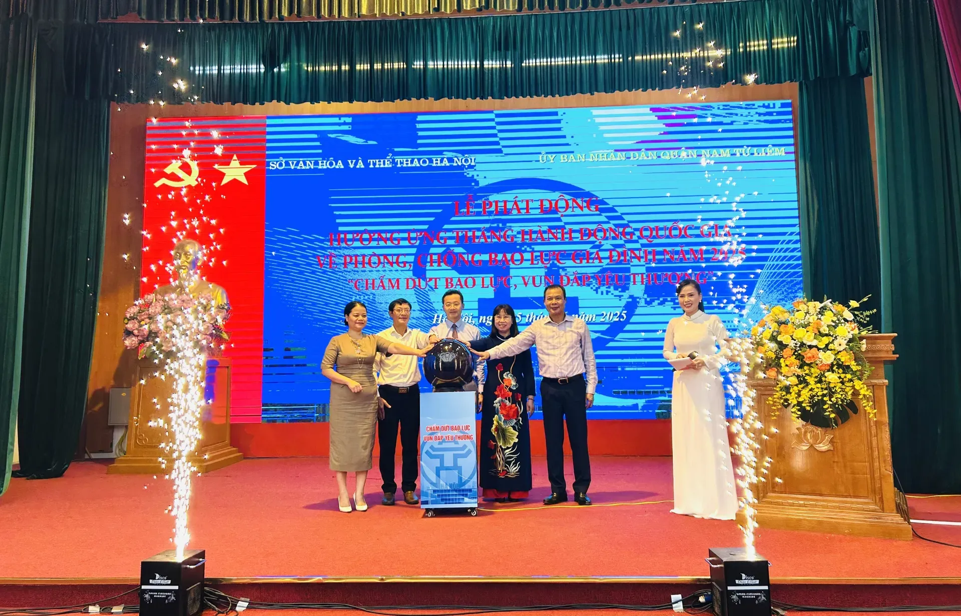 Các đại biểu thực hiện nghi thức phát động Tháng hành động quốc gia về phòng, chống bạo lực gia đình năm 2025. Ảnh: Trần Oanh