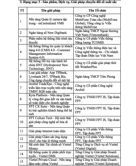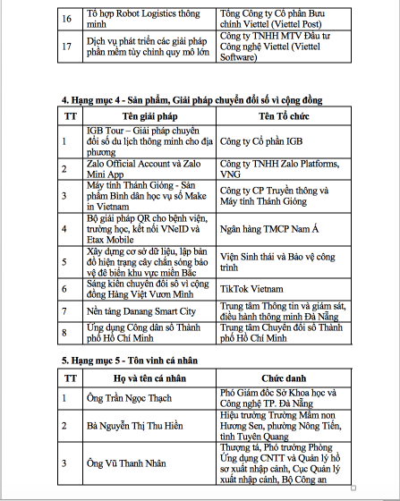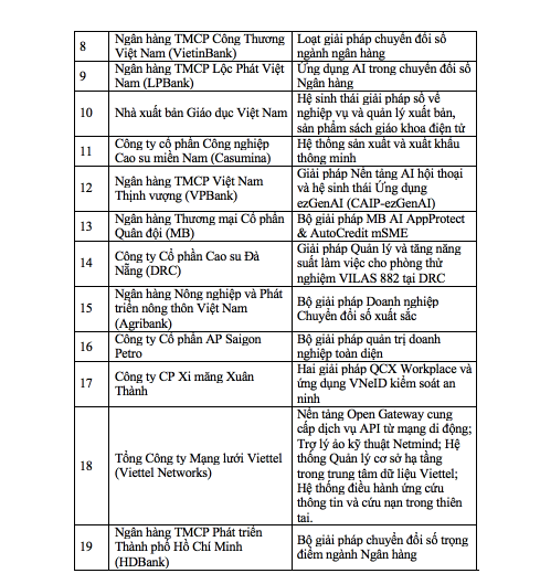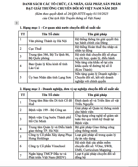 Dưới đây là danh sách các tổ chức, cá nhân, giải pháp, sản phẩm đạt Giải thưởng Chuyển đổi số việt nam năm 2025:
