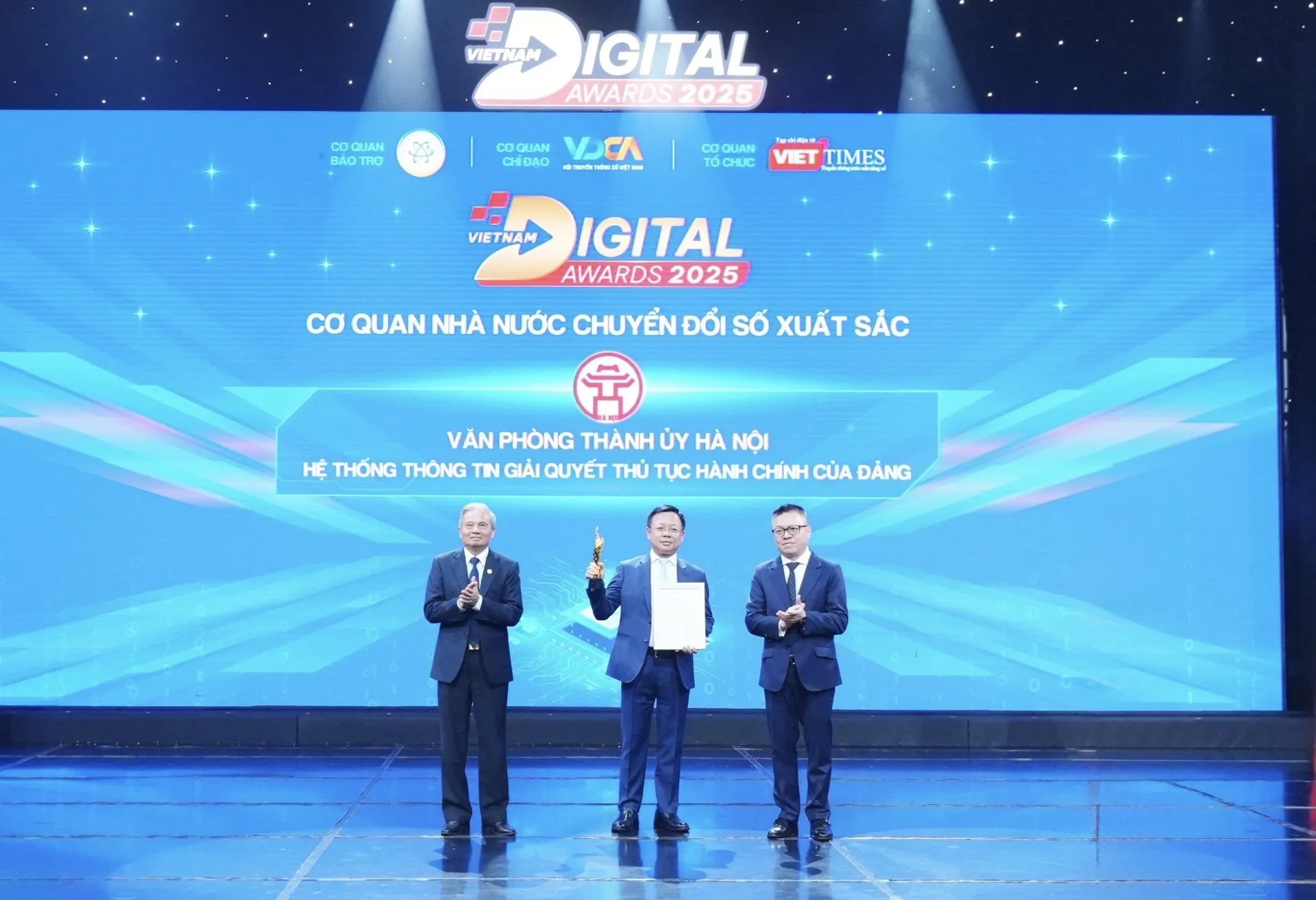 Với giải pháp Hệ thống thông tin giải quyết thủ tục hành chính của Đảng, Văn phòng Thành ủy Hà Nội đã được vinh danh ở hạng mục 1 – hạng mục Cơ quan nhà nước chuyển đổi số xuất sắc tại Lễ trao Giải thưởng Chuyển đổi số Việt Nam - Vietnam Digital Awards (VDA) 2025. Đây là hệ thống thông tin giải quyết thủ tục hành chính của Đảng đang được triển khai rộng khắp toàn TP Hà Nội với gần 500.000 (500 nghìn) đảng viên, 16 triệu lượt truy cập vào hệ thống với gần 400.000 (400 nghìn) tài khoản thường xuyên sử dụng. Thời gian tới, hệ thống sẽ triển khai tới các đảng bộ trên toàn quốc.