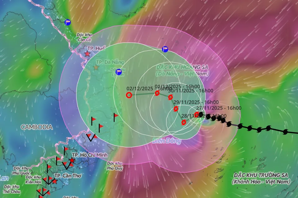 Dự báo đến 16 giờ hôm nay (28/11), bão số 15 di chuyển theo hướng Tây Tây Nam, tốc độ 3-5 km/giờ, cách Song Tử Tây 260 km về phía Tây Bắc. Cường độ giảm nhẹ còn cấp 11, giật cấp 14.