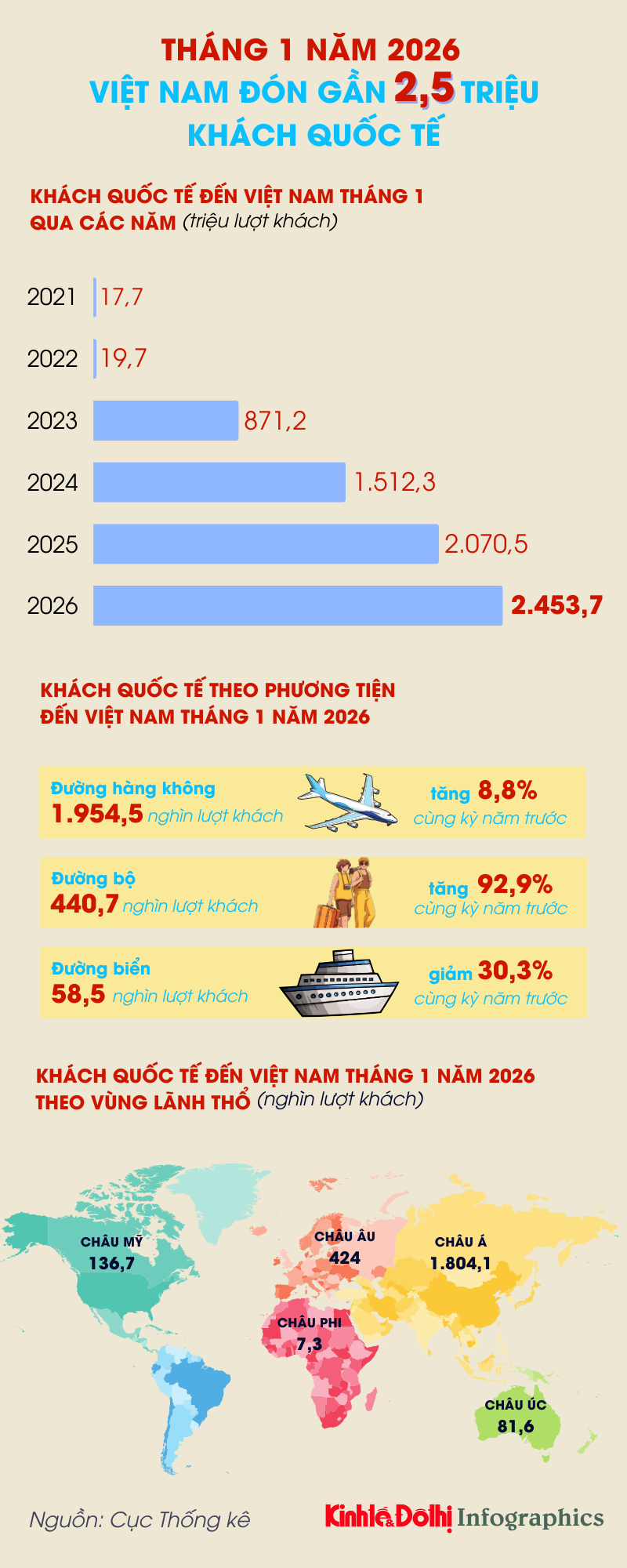 Kinhtedothi - Tháng 1/2026, Việt Nam đón gần 2,5 triệu lượt khách quốc tế. Đây là lượng khách cao nhất trong một tháng mà Việt Nam đón được từ trước đến nay, tăng 21,4% so với tháng trước và tăng 18,5% so với cùng kỳ năm 2025.