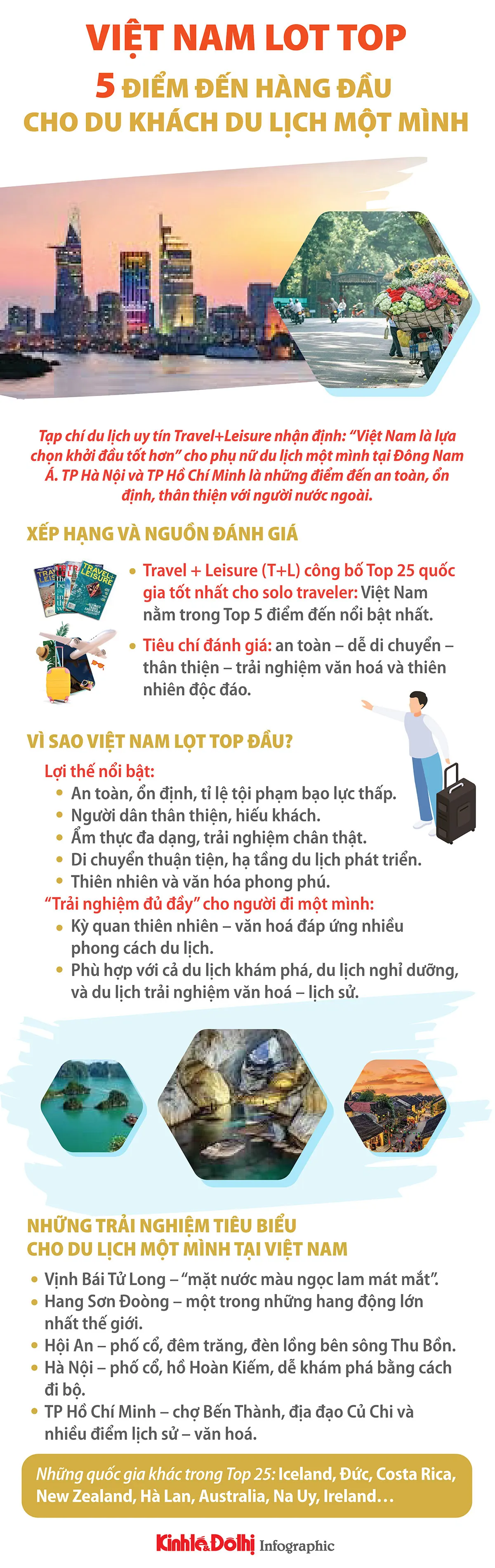Kinhtedothi - Tạp chí du lịch uy tín Travel+Leisure nhận định: “Việt Nam là lựa chọn khởi đầu tốt hơn” cho phụ nữ du lịch một mình tại Đông Nam Á. TP Hà Nội và TP Hồ Chí Minh là những điểm đến an toàn, ổn định, thân thiện với người nước ngoài.