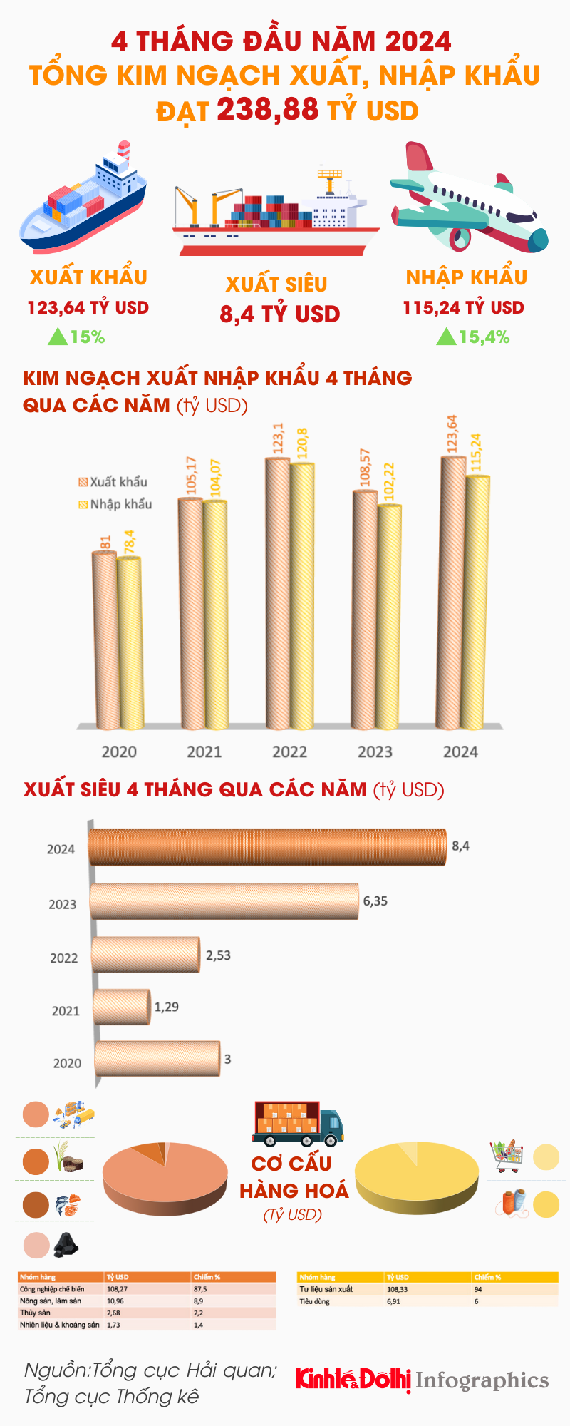 Kinhtedothi - Theo số liệu của Tổng cục Thống kê, tổng kim ngạch xuất, nhập khẩu hàng hóa 4 tháng đầu năm 2024 đạt gần 239 tỷ USD, tăng 15,2% so với cùng kỳ năm trước. Cán cân thương mại hàng hoá tiếp tục ghi nhận thặng dư ở mức cao khi xuất siêu đạt 8,4 tỷ USD.