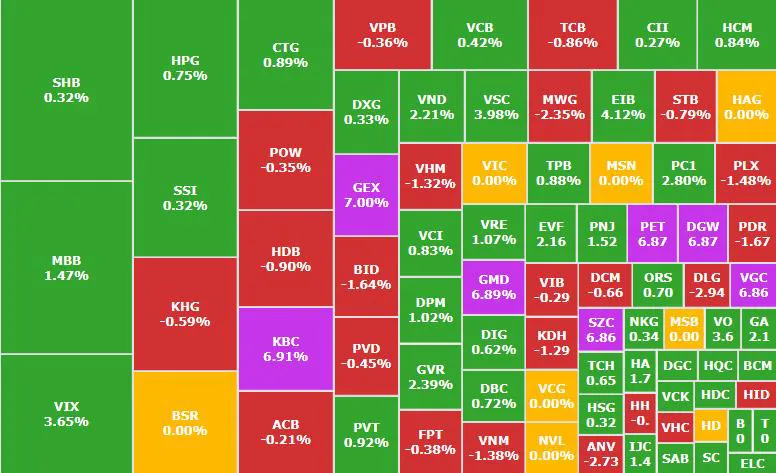 Tâm điểm dòng tiền tiếp tục đổ vào nhóm bất động sản khu công nghiệp. Toàn thị trường ghi nhận 32 mã tăng trần, nổi bật là KBC, VGC, SZC, PHR, DPR. Nhóm Gelex cũng giao dịch bùng nổ khi GEX và GEE đồng loạt tăng hết biên độ.