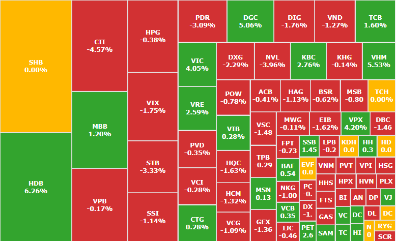 Ngoài nhóm Vingroup, điểm sáng đáng chú ý khác đến từ HDBank. Cổ phiếu HDB bứt phá mạnh vào cuối phiên, tăng tới 6,3% lên gần 30.000 đồng/cổ phiếu, dẫn đầu nhóm ngân hàng về biên độ tăng giá. Một số mã ngân hàng khác như TCB, SSB, MBB, CTG, VCB và VIB tăng nhẹ từ 0,3–1,6%. Ngược lại, STB chịu áp lực bán khá mạnh, giảm 3,3%, trong khi EIB, BID và MSB cũng lùi khoảng 1%.