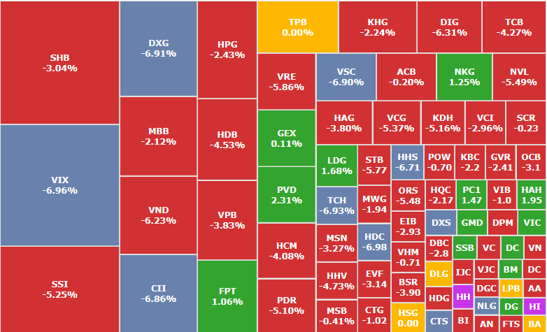 Nhóm tài chính – ngân hàng – chứng khoán trở thành tâm điểm tiêu cực khi hàng loạt cổ phiếu giảm sâu: VIX (-6,96%), SSI (-5,25%), SHS (-9,57%), TCB (-4,27%), HDB (-4,53%), VPB (-3,83%), MBB (-2,12%). Chỉ số ngành tài chính mất tới 4,35%, mạnh nhất trong các nhóm ngành.