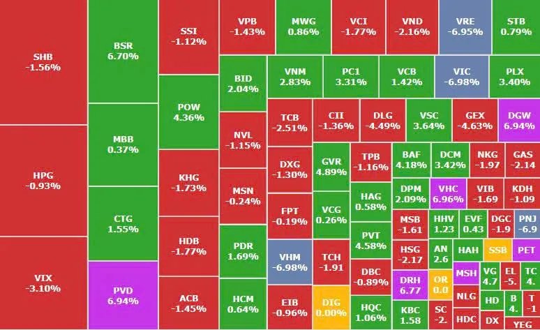 Trong bức tranh nhiều gam màu xám, nhóm dầu khí bất ngờ trở thành điểm sáng hiếm hoi. Dòng tiền đầu cơ đổ mạnh vào nhóm này giúp PVD tăng trần 6,9%, BSR tăng 6,7%, PVS tăng 5,9% và PLX tăng 3,4%. Đà tăng mạnh của nhóm năng lượng góp phần kìm hãm đà bán tháo lan rộng.
