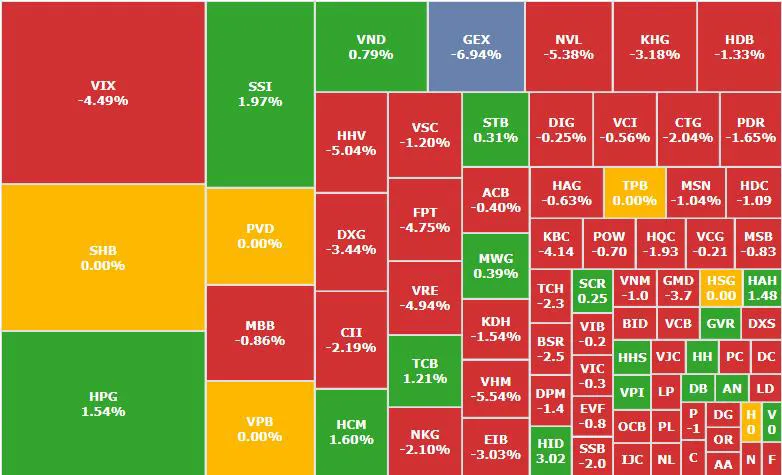 Các cổ phiếu vốn hóa lớn khác như FPT (–4,8%), BCM (–2,9%), GAS (–2,7%), CTG (–2%) hay VNM (–1%) cũng đồng loạt giảm sâu.