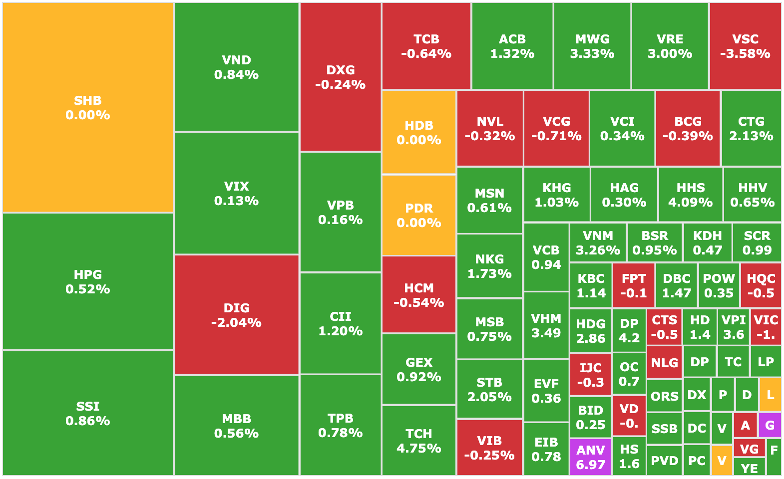 Ngân hàng vẫn là nhóm trụ cột với đa số mã tăng điểm: CTG, STB, ACB, VCB, MSB đều tăng từ 1-2,5%. Riêng MBB gần như đi ngang, trong khi TCB và VIB điều chỉnh nhẹ. Chứng khoán và bán lẻ cũng giao dịch khởi sắc với SSI (+0,98%), VIX (+1,6%), MWG (+3,59%), FRT (+2,38%)… Ở nhóm bất động sản, dòng tiền phân hóa rõ nét: VHM, VRE, KDH, TCH tăng mạnh, trong khi DIG và NLG tiếp tục suy yếu.