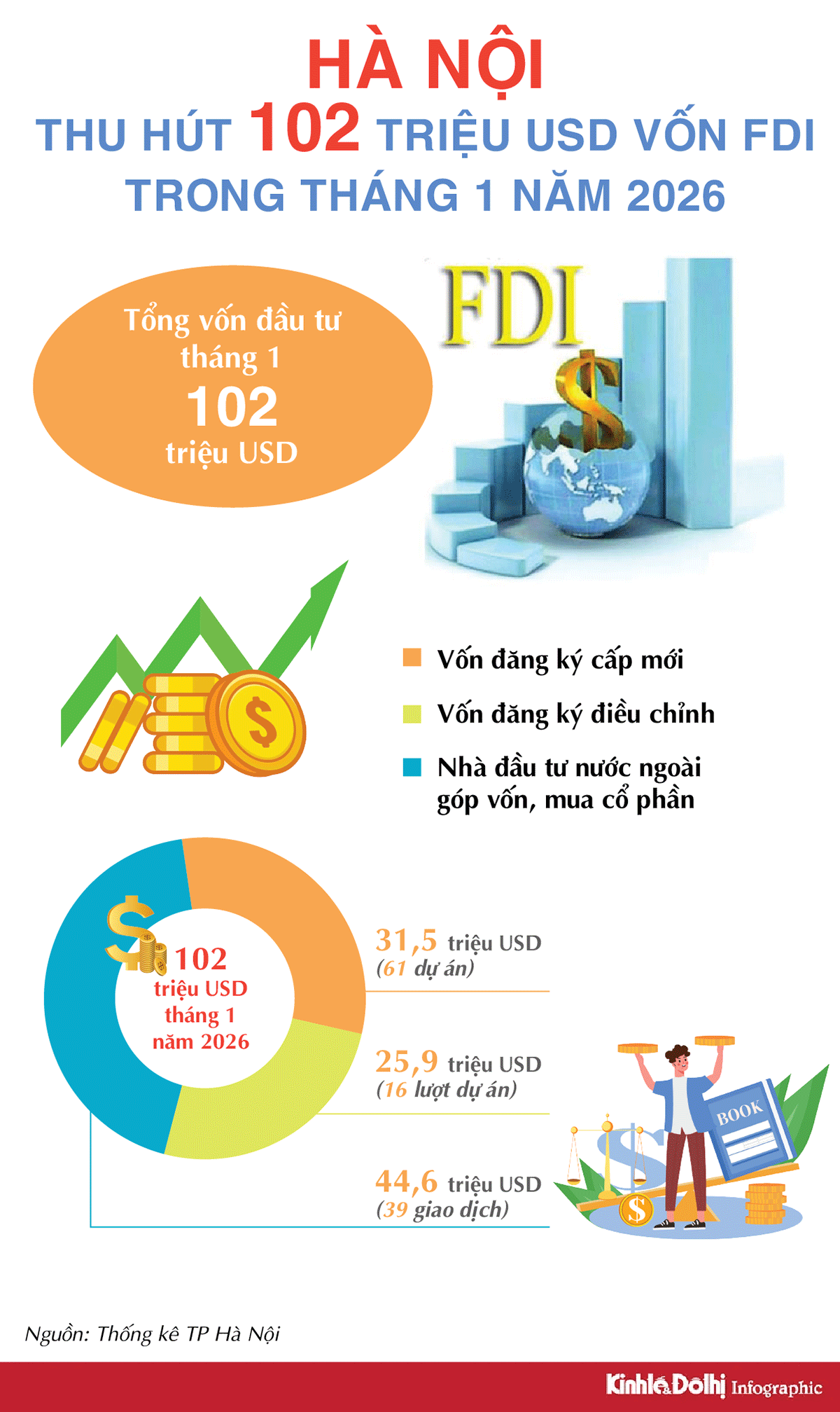 Kinhtedothi - Trong tháng 1/2026, TP Hà Nội ghi nhận tổng vốn đầu tư trực tiếp nước ngoài (FDI) đạt 102 triệu USD, cho thấy tín hiệu tích cực về môi trường đầu tư ngay từ đầu năm.