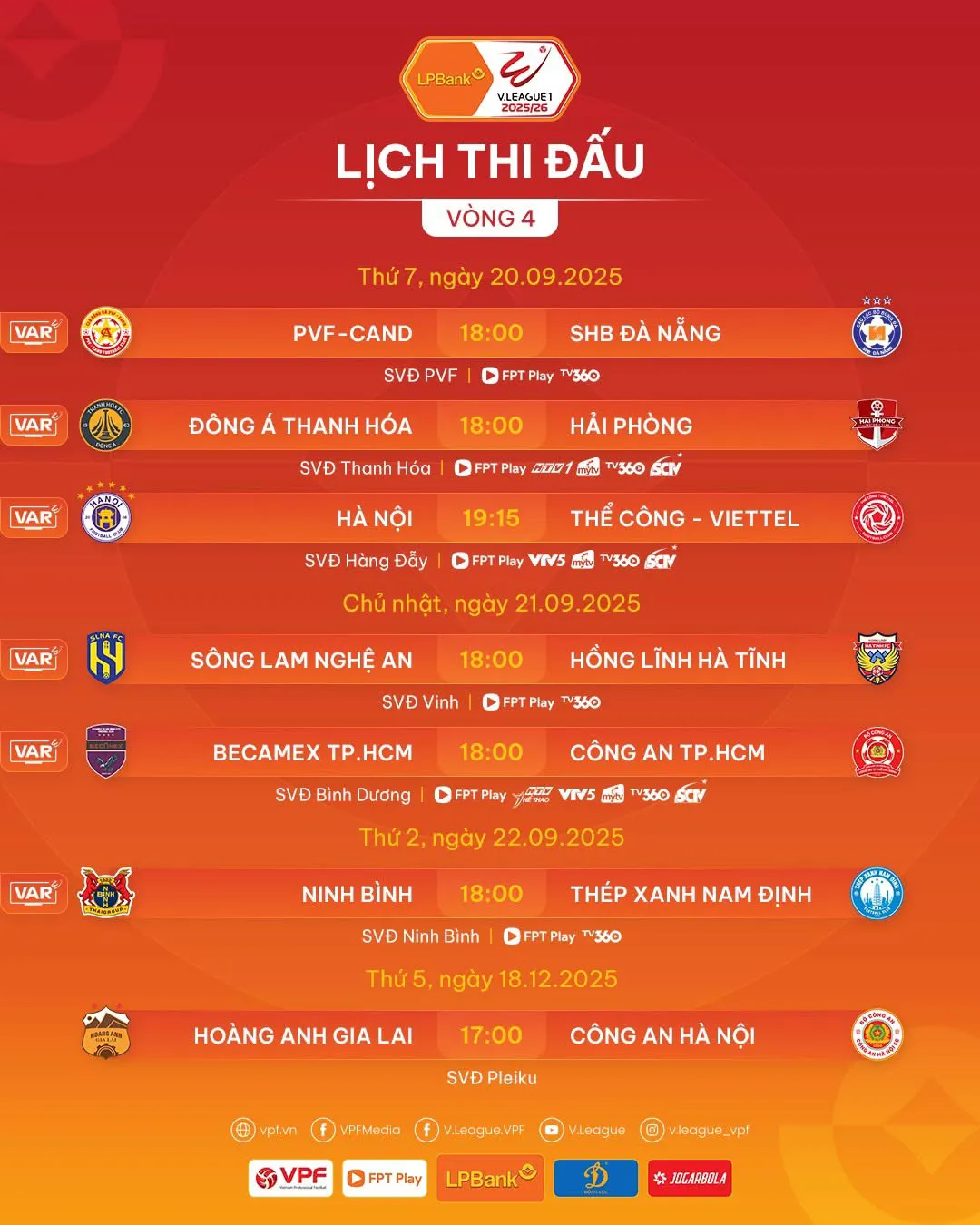 Một số trận đấu khác của vòng 4 V-League 2025-2026 là PVF-CAND tiếp đón Đà Nẵng. Ngoài ra, SLNA tiếp đón Hà Tĩnh và Becamex TP Hồ Chí Minh đối đầu với Công an TP Hồ Chí Minh và HAGL gặp CAHN.