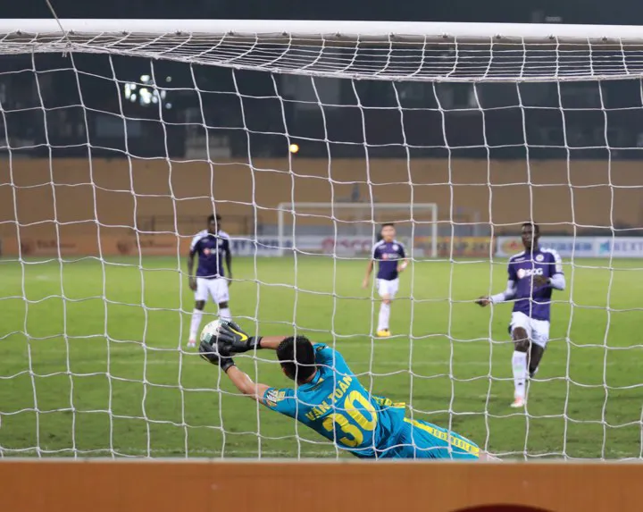 | Tình huống Văn Toản đẩy thành công quả phạt đền trong hiệp 1 của trận đấu. |