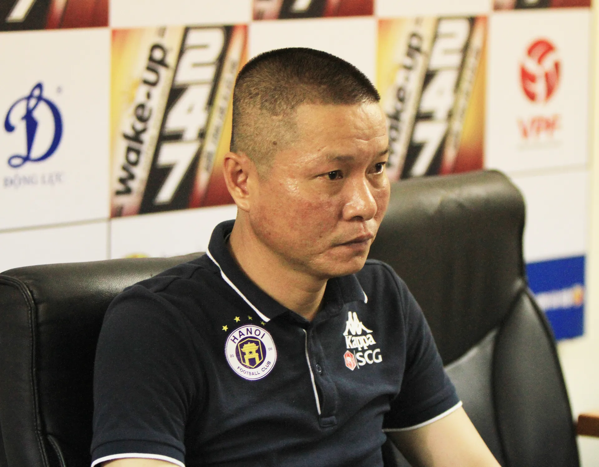 | HLV Chu Đình Nghiêm tại buổi họp báo sau trận đấu. |