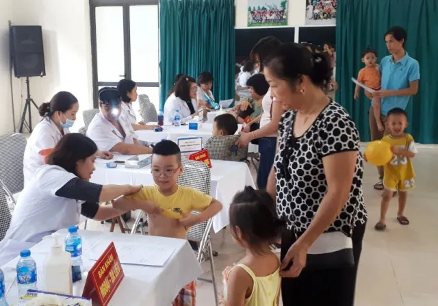 | Trẻ xếp hàng khám tại Nhà Văn hóa phường Hạ Đình. |
