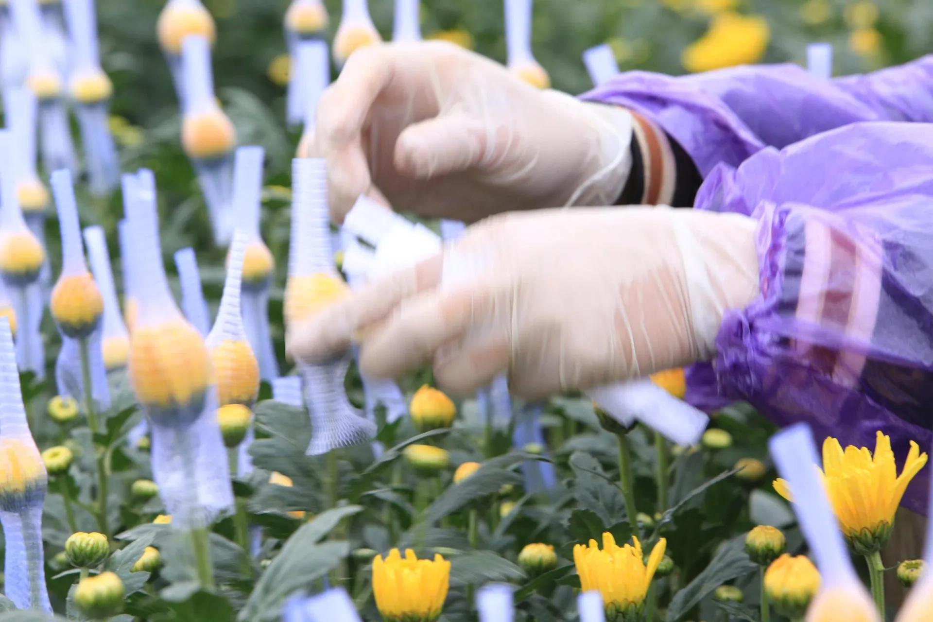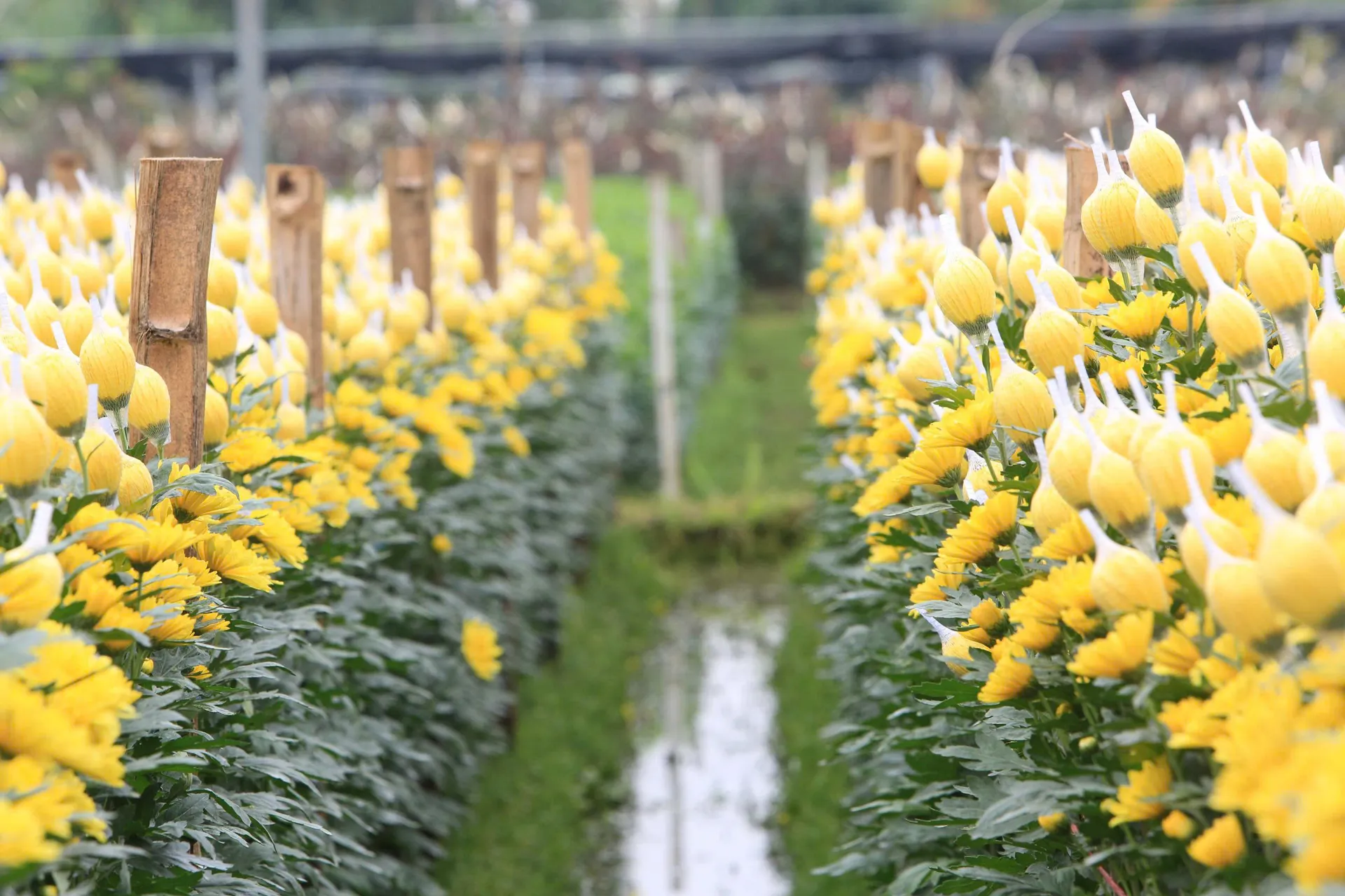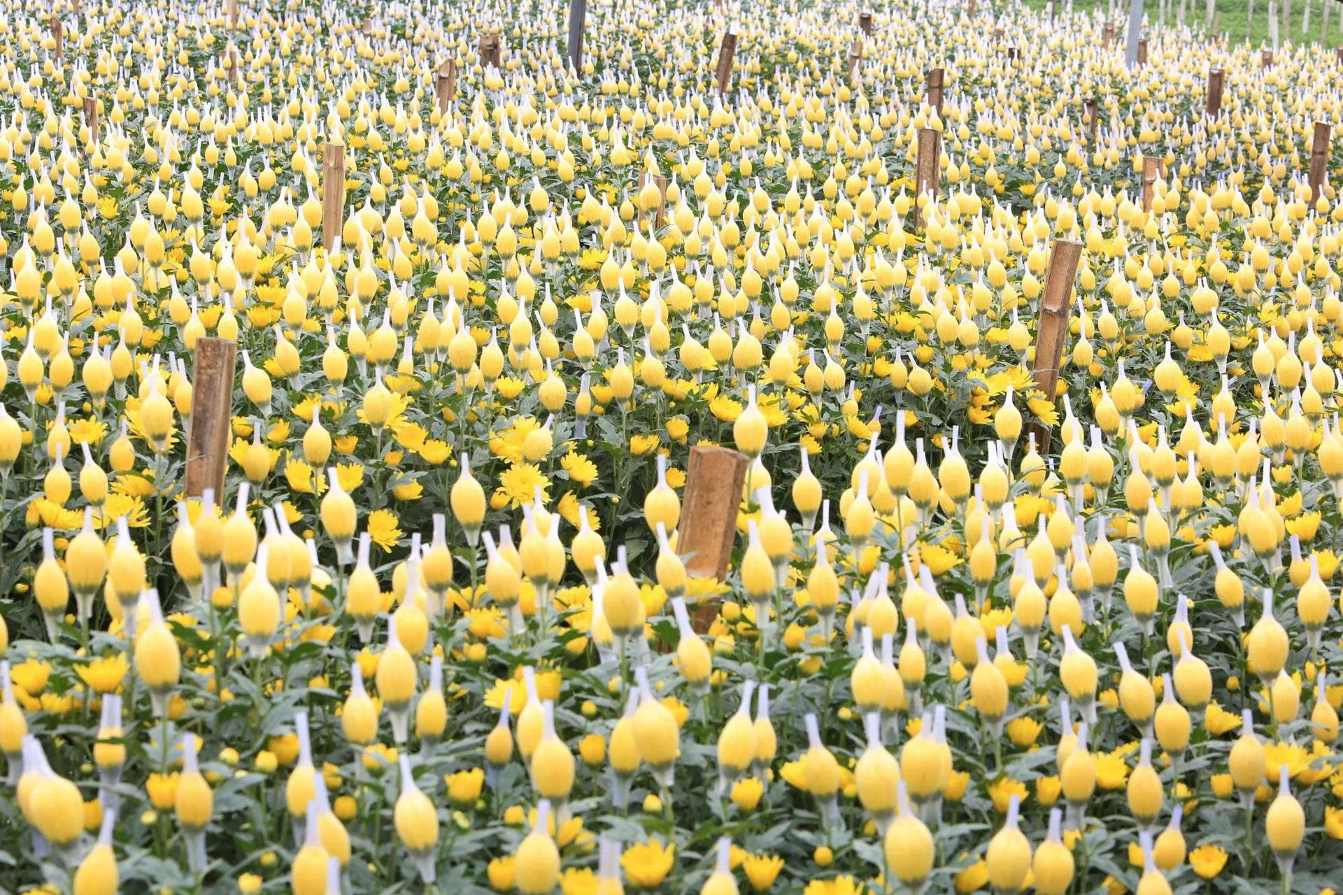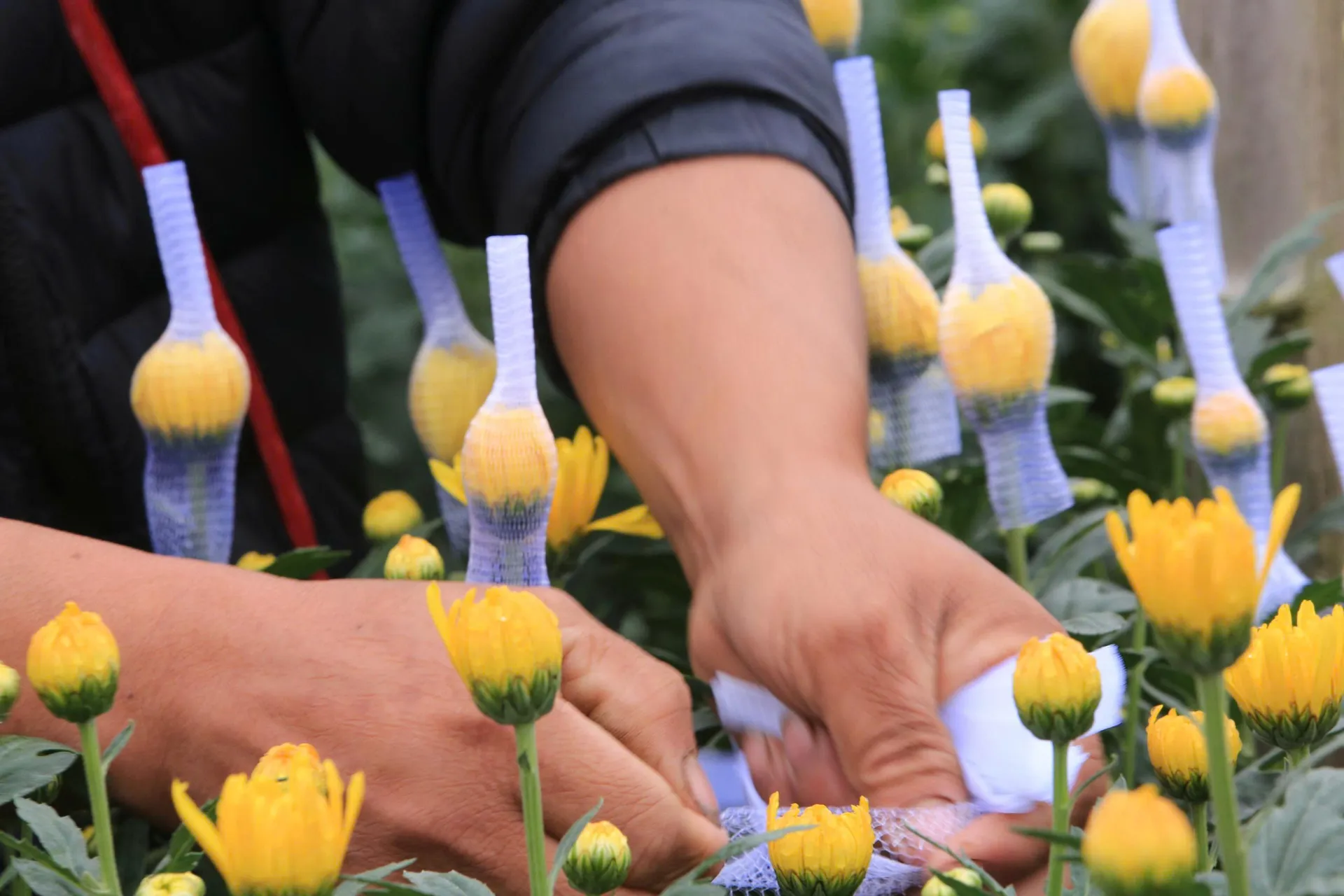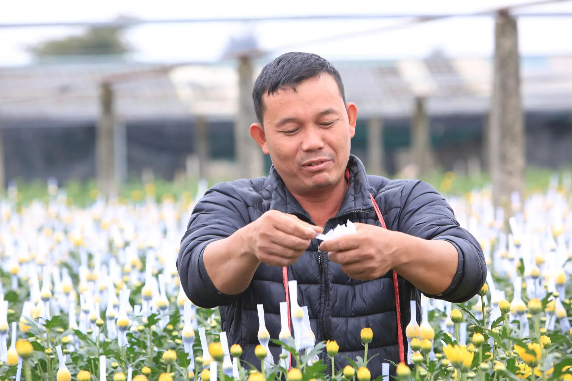 Những nụ hoa bọc túi trắng nổi bật trên nền xanh lá và sắc vàng hoa cúc, tạo nên bức tranh yên bình ở vựa hoa xứ Thanh.