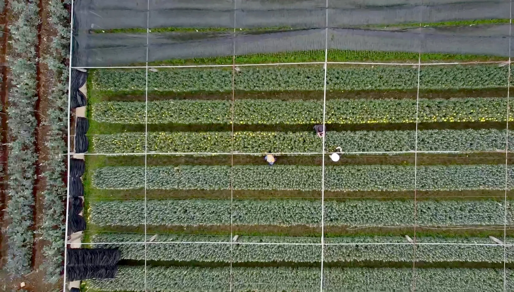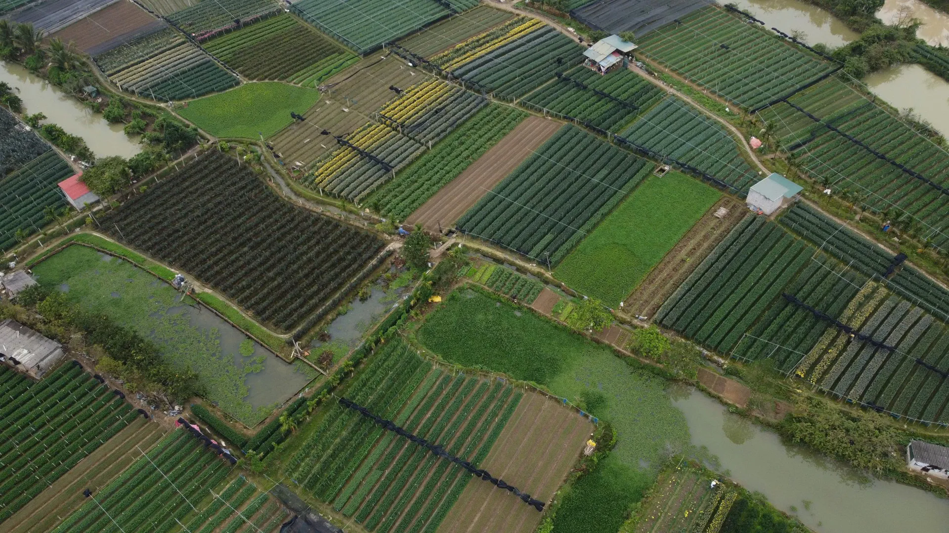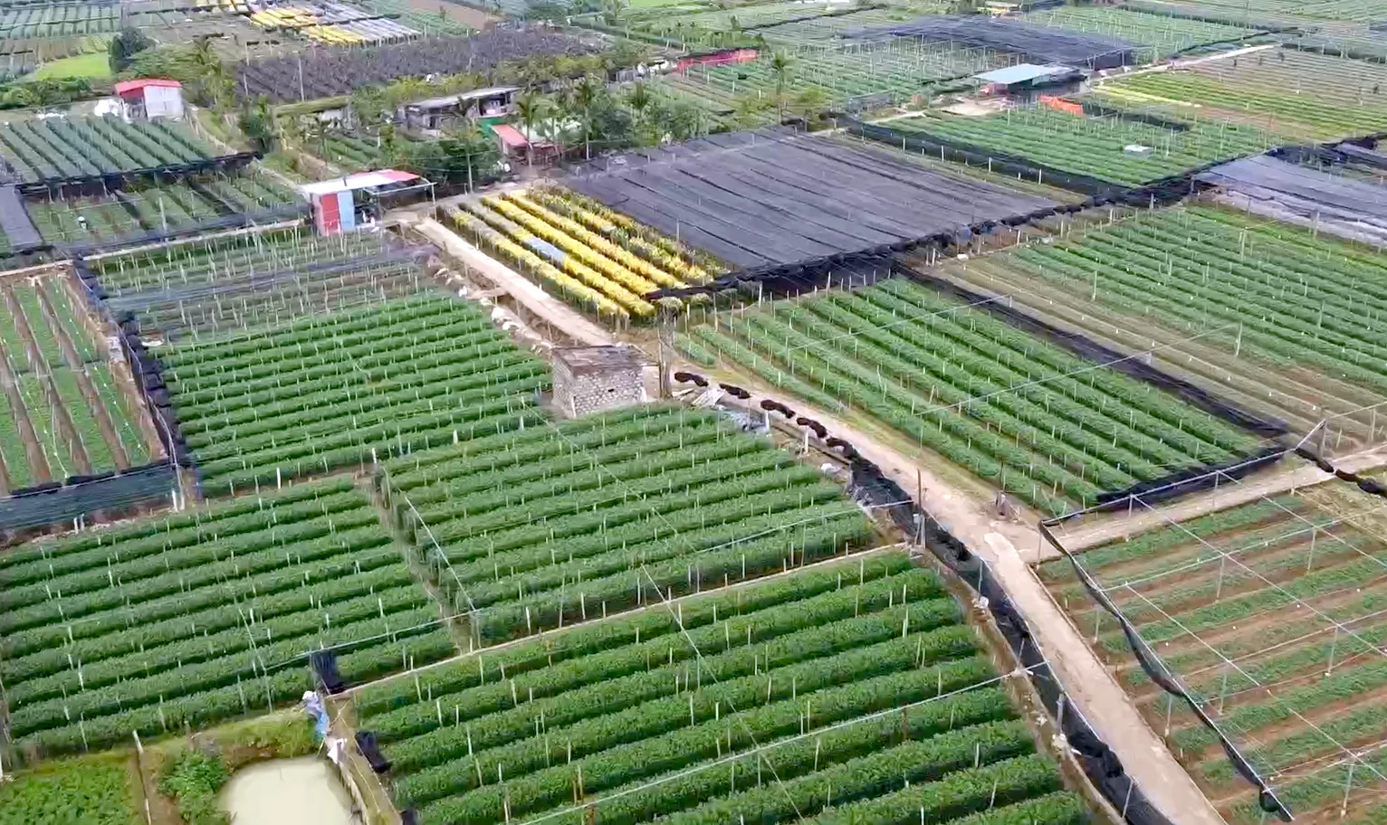 Toàn cảnh làng hoa Đông Cương rực rỡ sắc xanh non, những luống hoa thẳng tắp trải dài, báo hiệu một mùa vụ Tết đang đến rất gần.