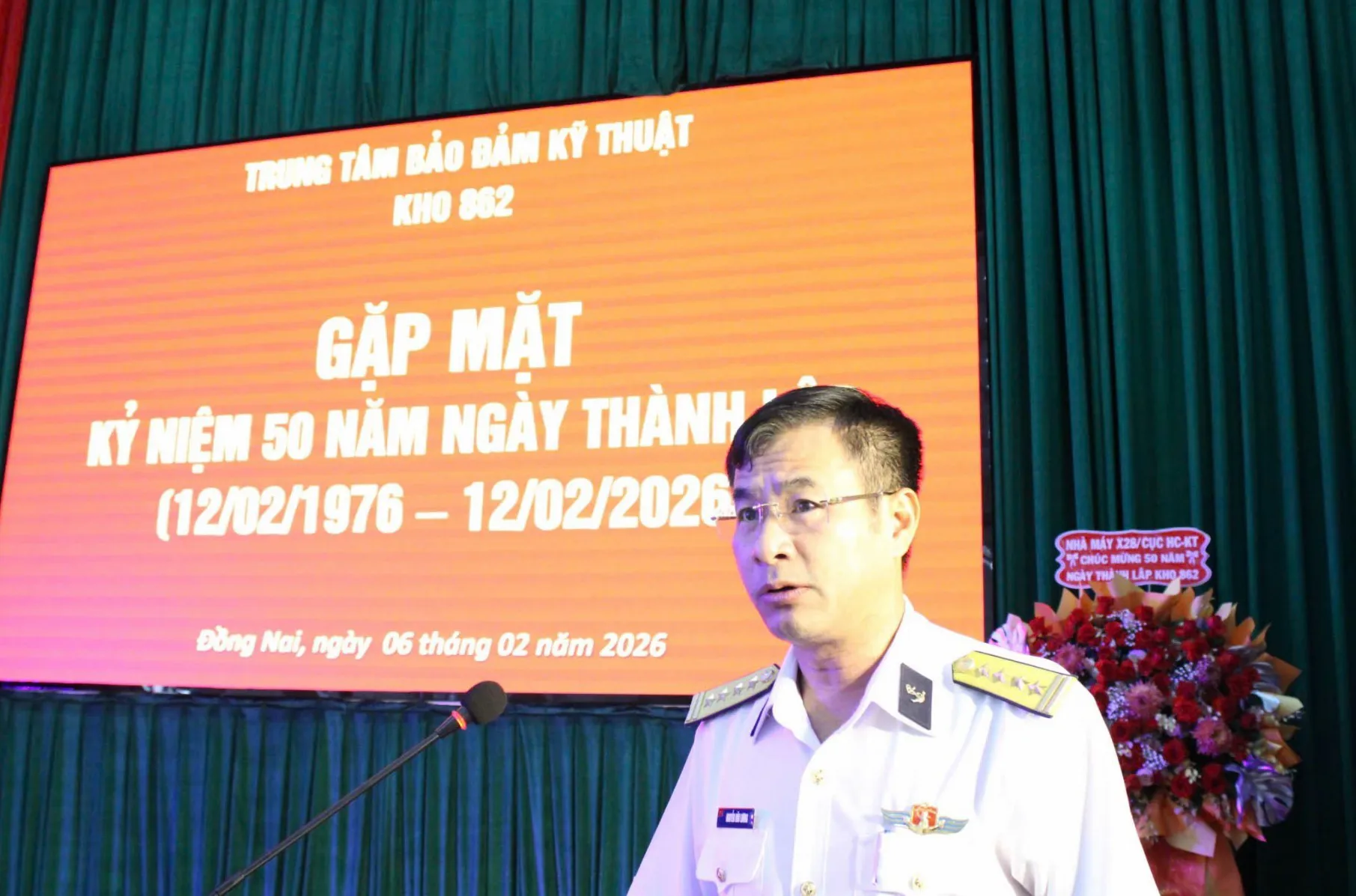 Kinhtedothi - Chiều 6/2, tại xã nhơn Trạch, tỉnh Đồng Nai, Kho 862 thuộc Trung tâm Bảo đảm kỹ thuật (BĐKT) Vùng 2 Hải quân tổ chức gặp mặt kỷ niệm 50 năm Ngày thành lập đơn vị (12/2/1976 - 12/2/2026). Đại tá Nguyễn Hữu Lương, Bí thư Đảng ủy, Chính ủy Trung tâm BĐKT dự, chỉ đạo.