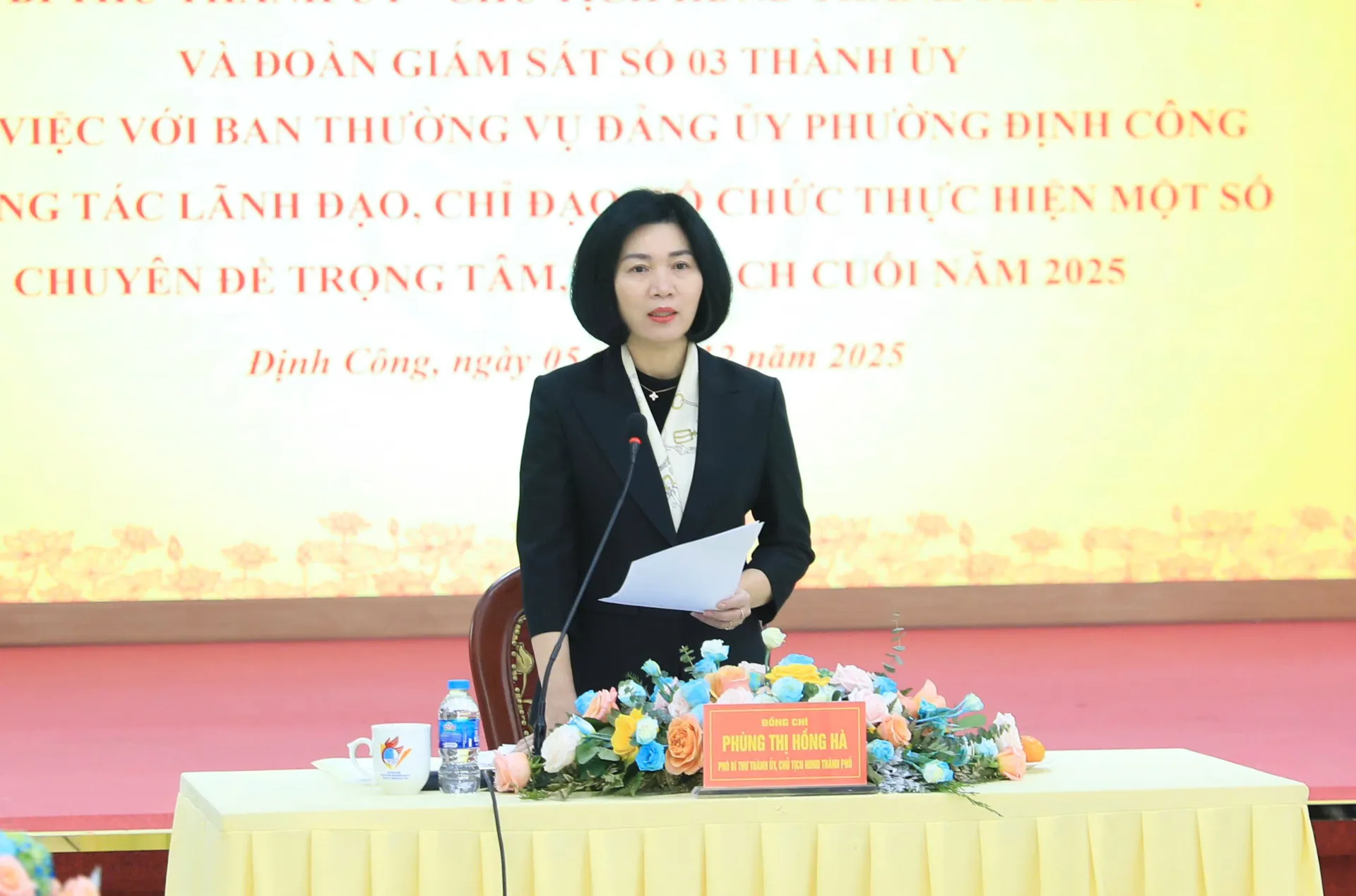 Chiều 5/12, Đoàn giám sát số 3 của Ban Thường vụ Thành ủy Hà Nội do Phó Bí thư Thành ủy, Chủ tịch HĐND TP Phùng Thị Hồng Hà làm Trưởng đoàn đã làm việc với Ban Thường vụ phường Đảng ủy phường Định Công về công tác lãnh đạo, chỉ đạo, tổ chức thực hiện một số chuyên đề trọng tâm, cấp bách cuối năm 2025; kiểm điểm tập thể Ban Thường vụ Đảng ủy phường năm 2025.
